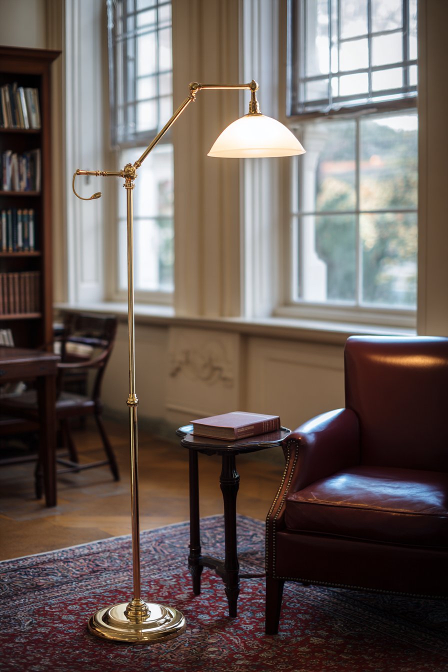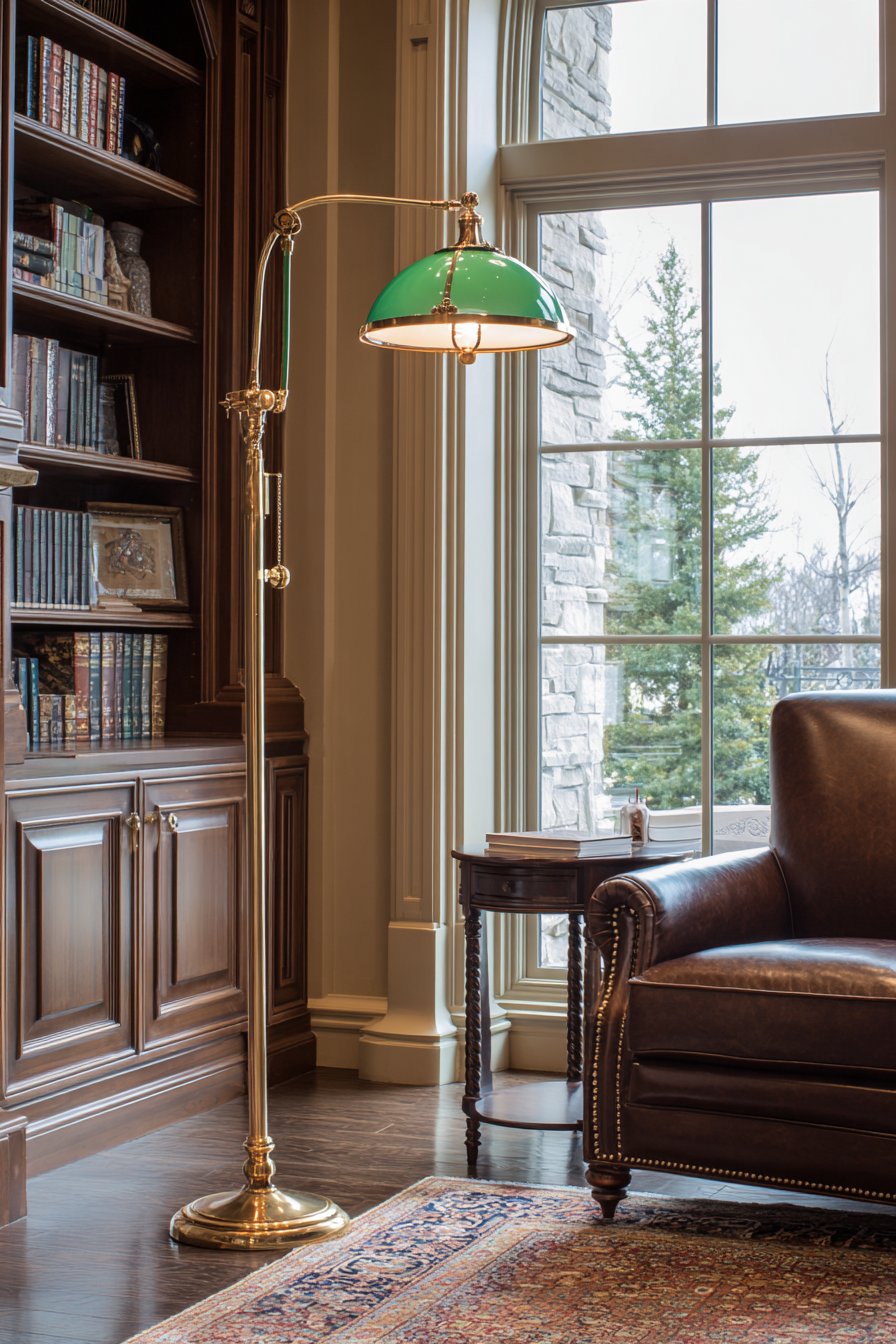 The elegant brass pharmacy floor lamp with adjustable swing arm and green glass shade represents timeless sophistication that transcends passing trends. Standing beside a classic leather reading chair with nailhead trim and a mahogany side table, this lamp could belong equally to a distinguished gentleman’s study or a contemporary living room that values traditional craftsmanship. The polished brass finish develops subtle patina over time, adding character and depth that new finishes cannot replicate. The green glass shade provides the signature look associated with banker’s lamps and traditional library lighting, filtering light with a warm, scholarly glow.