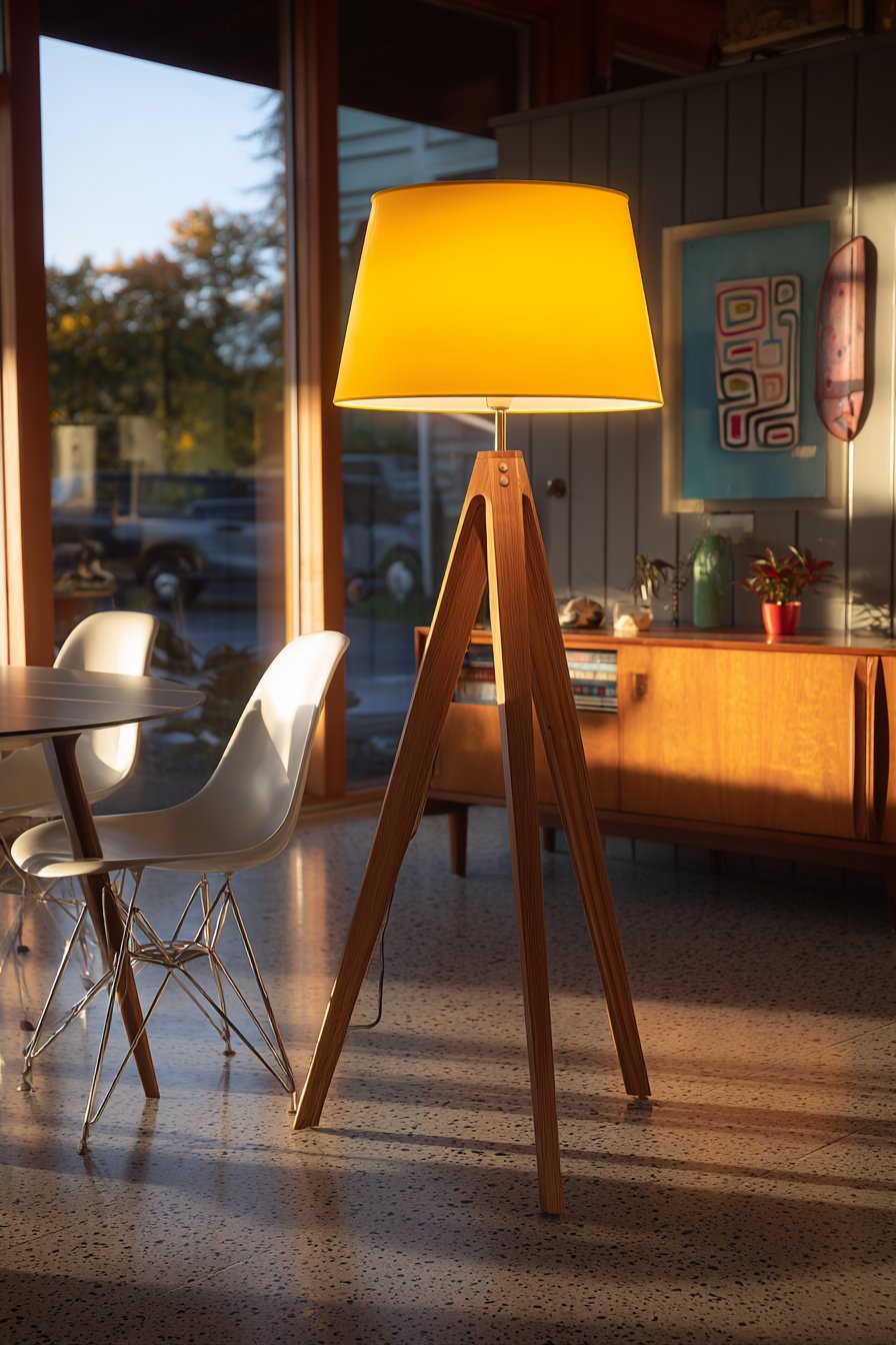 The iconic three-legged floor lamp with teak wood base and fiberglass shade in mustard yellow captures the optimistic spirit of mid-century modern design. This lamp illuminates a conversation area featuring a low-profile walnut credenza and molded plastic chairs, creating a cohesive homage to the design revolution of the 1950s and 60s. The teak wood base showcases the beautiful grain patterns prized by mid-century designers, while the fiberglass shade—once a cutting-edge material—demonstrates the era’s embrace of new manufacturing technologies and synthetic materials.