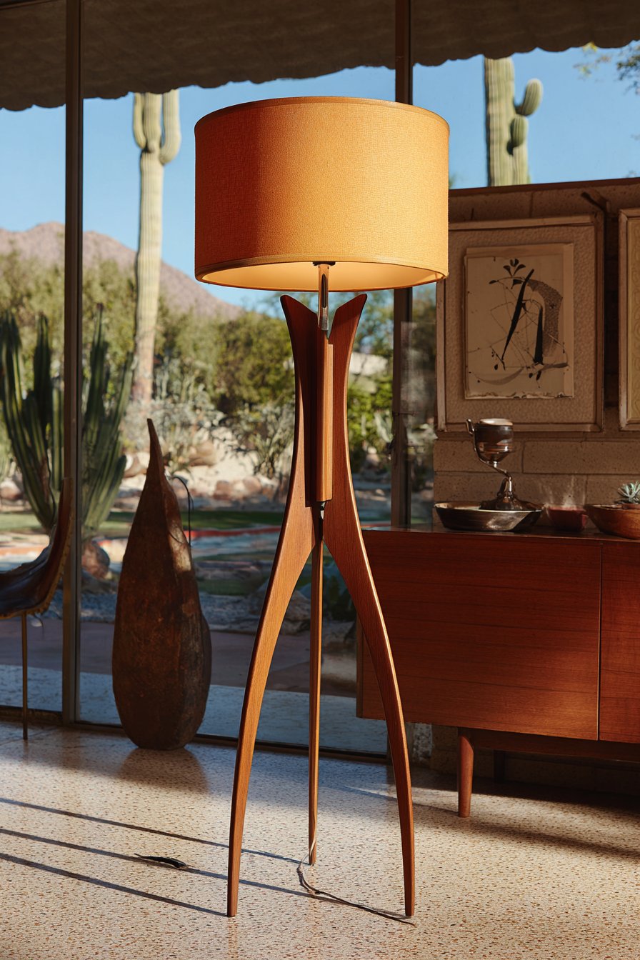 - Pair wooden tripod lamps with other natural materials like linen, wool, and leather for cohesive organic aesthetic