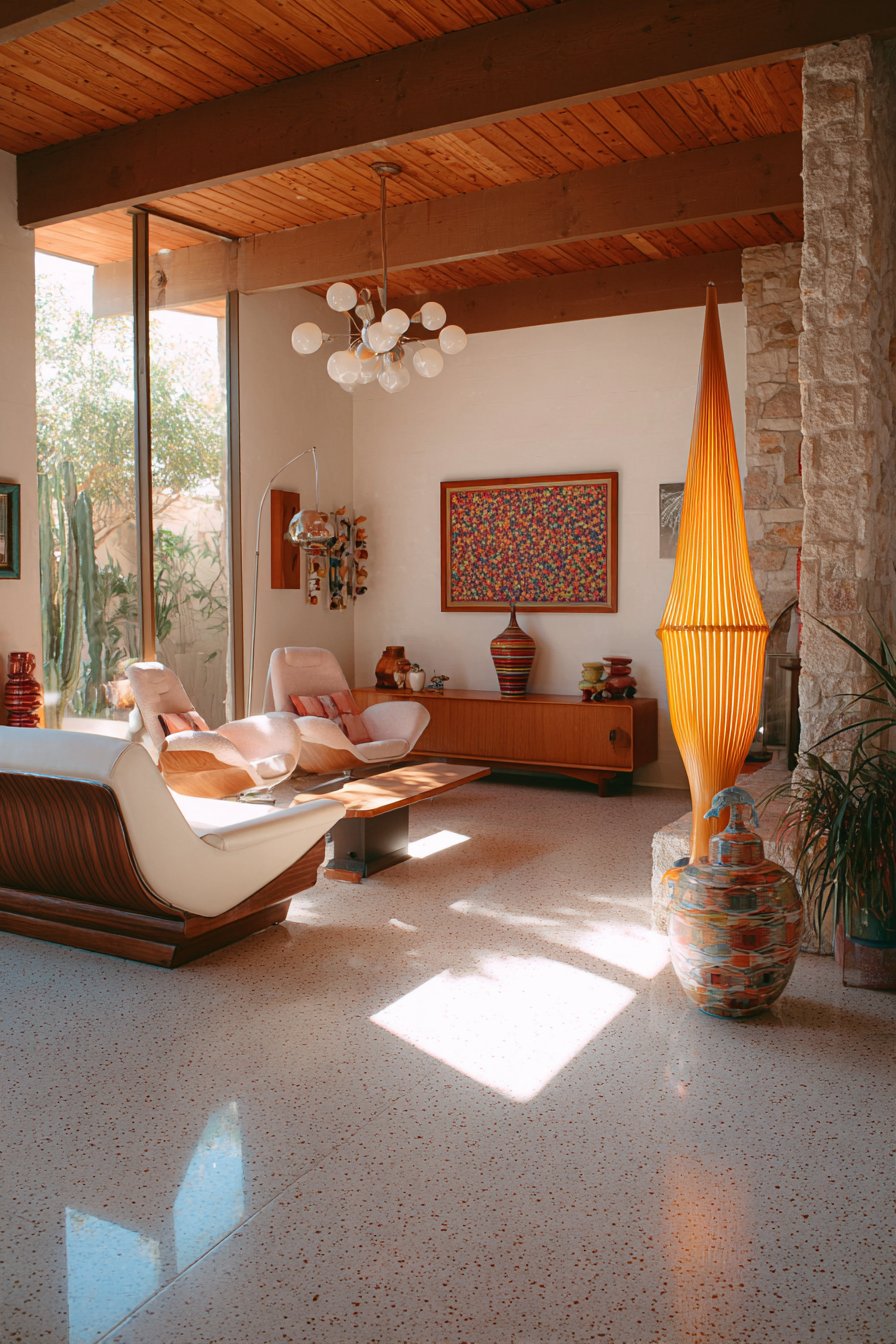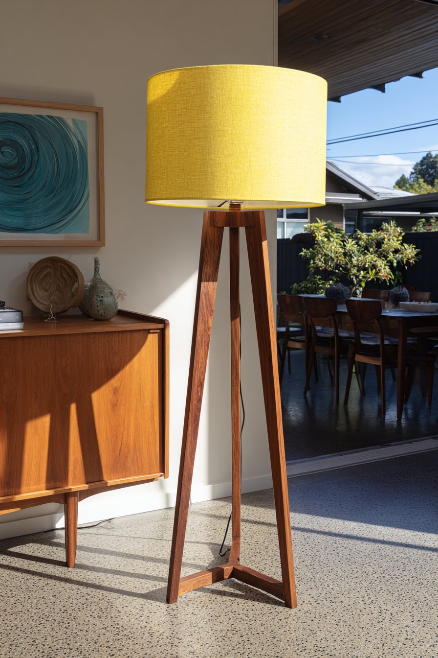 The living room context reinforces the period authenticity with carefully selected elements. Terrazzo flooring introduces the speckled pattern popular during this era, while abstract art on the walls references the contemporary art movements that influenced furniture and lighting design. The mustard yellow shade adds a bold pop of color characteristic of mid-century palettes that weren’t afraid of saturated hues. Natural daylight emphasizes the clean lines and organic shapes that define this design movement. Interior design photography with attention to era-authentic details captures the lamp’s sculptural quality and warm retro glow.