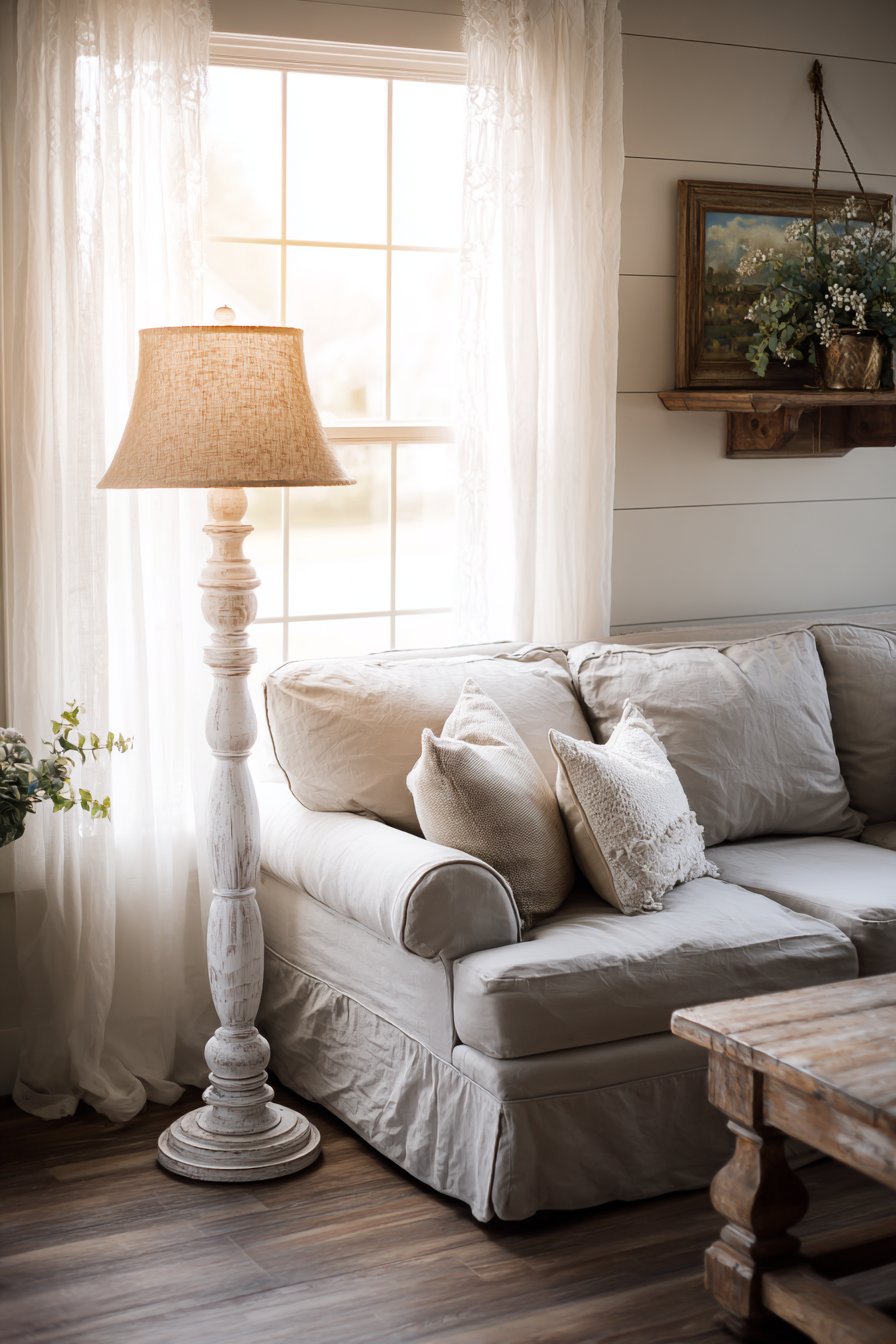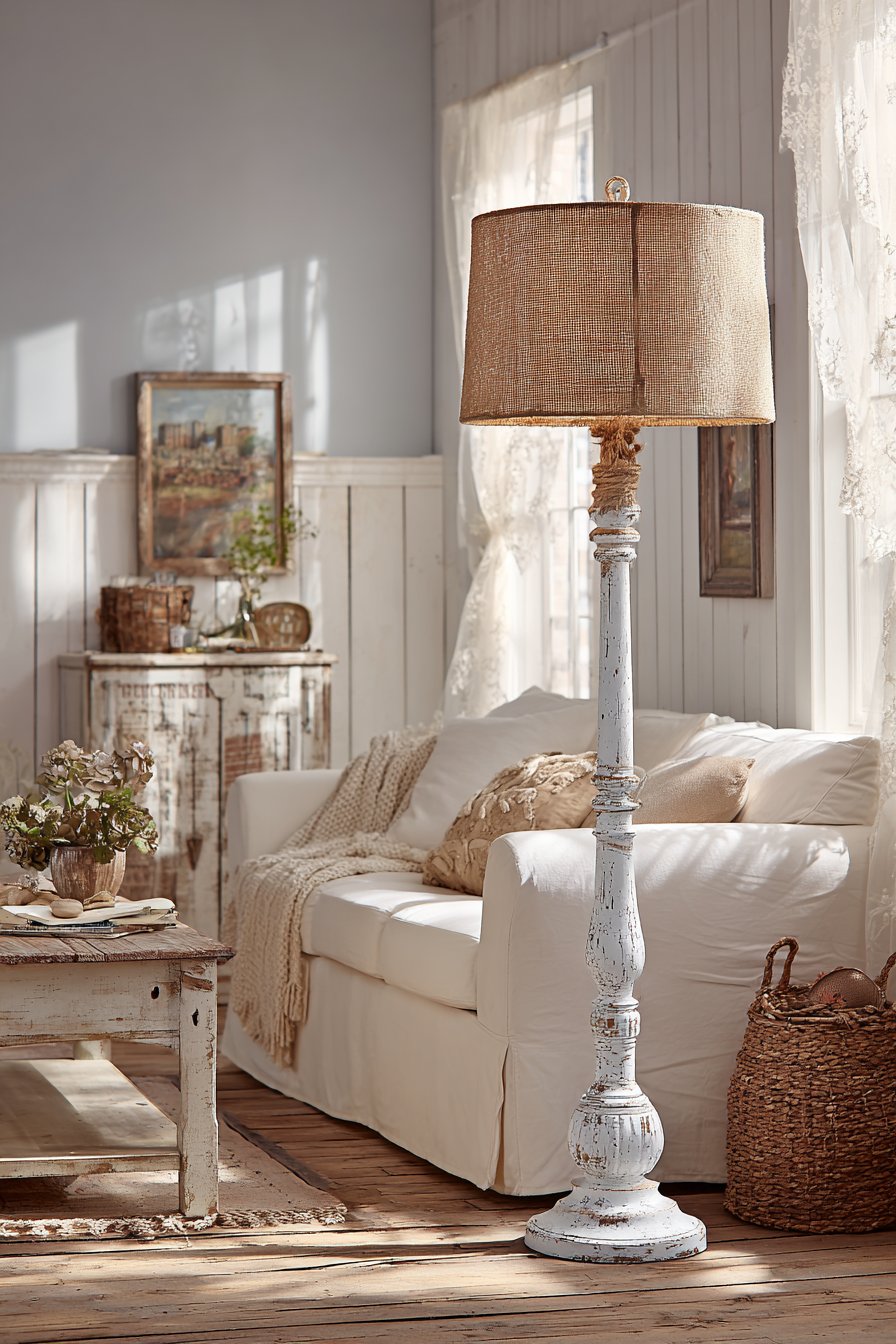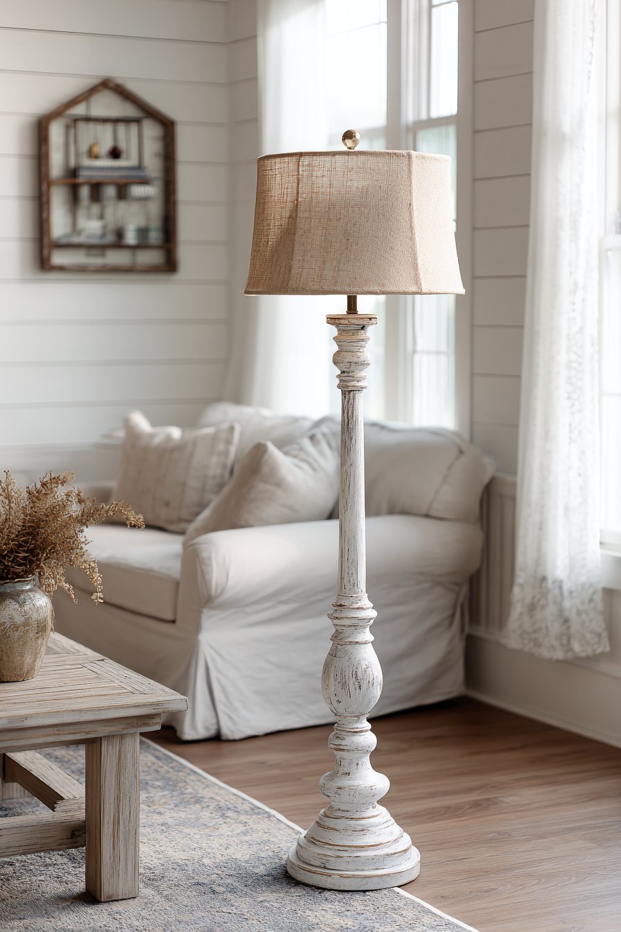 The rustic floor lamp with distressed white painted wood base and burlap drum shade brings farmhouse charm to casual, comfortable living spaces. Standing beside a slipcovered sofa in natural linen with a weathered wood coffee table, this lamp celebrates imperfection and lived-in comfort over polished perfection. The distressed white paint shows intentional wear and aging, creating the appearance of a well-loved piece with history and character. The burlap shade introduces natural texture and filters light with warm, diffused quality perfect for creating cozy evening ambiance.