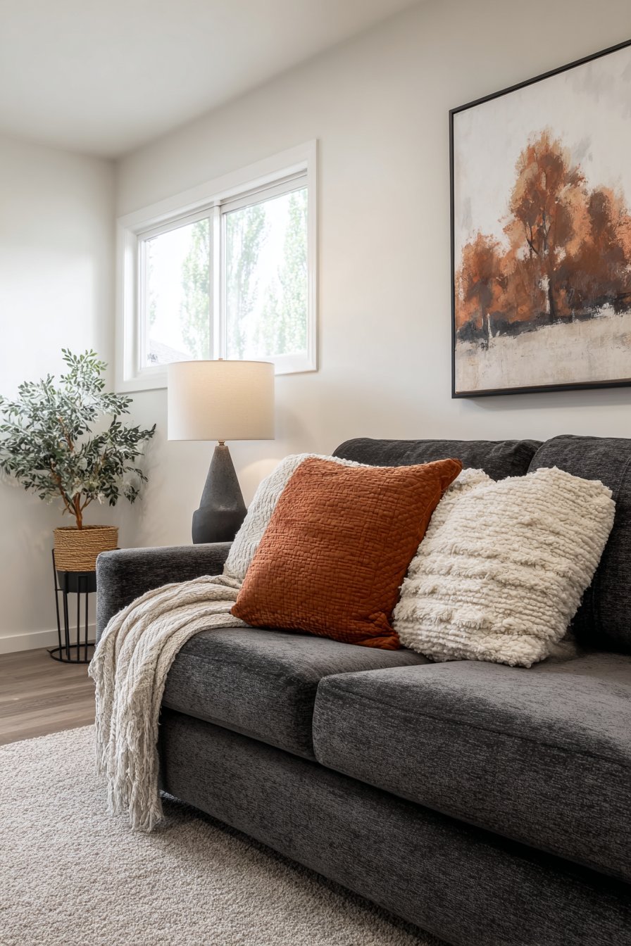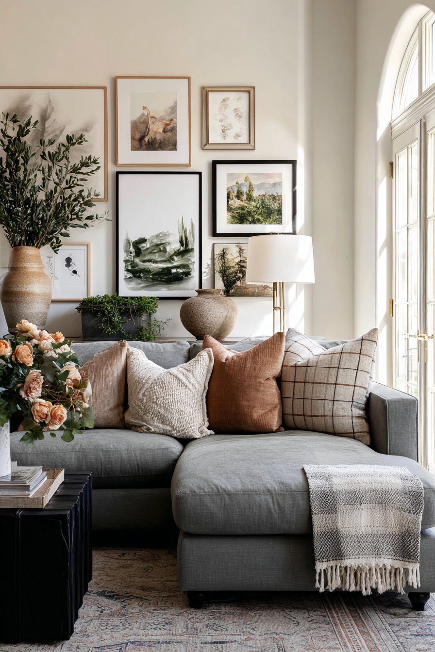 A large-scale abstract canvas in warm earth tones creates an immediate and powerful focal point above your couch. This approach works exceptionally well in contemporary and transitional spaces where you want to make a confident design statement without overwhelming the room. The beauty of abstract art lies in its versatility—the warm palette of terracotta, ochre, and cream tones brings organic warmth to the space while remaining sophisticated enough for formal settings.