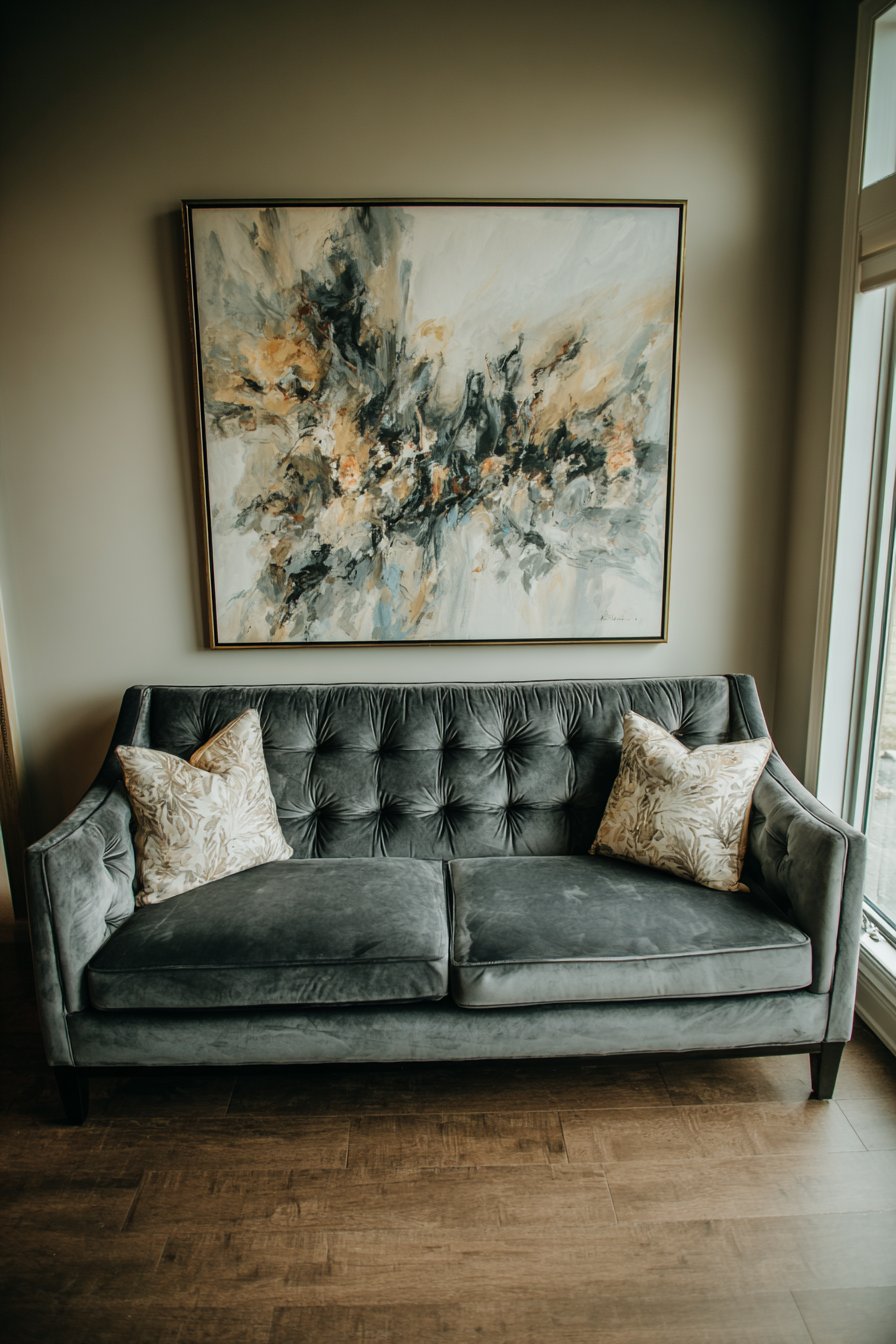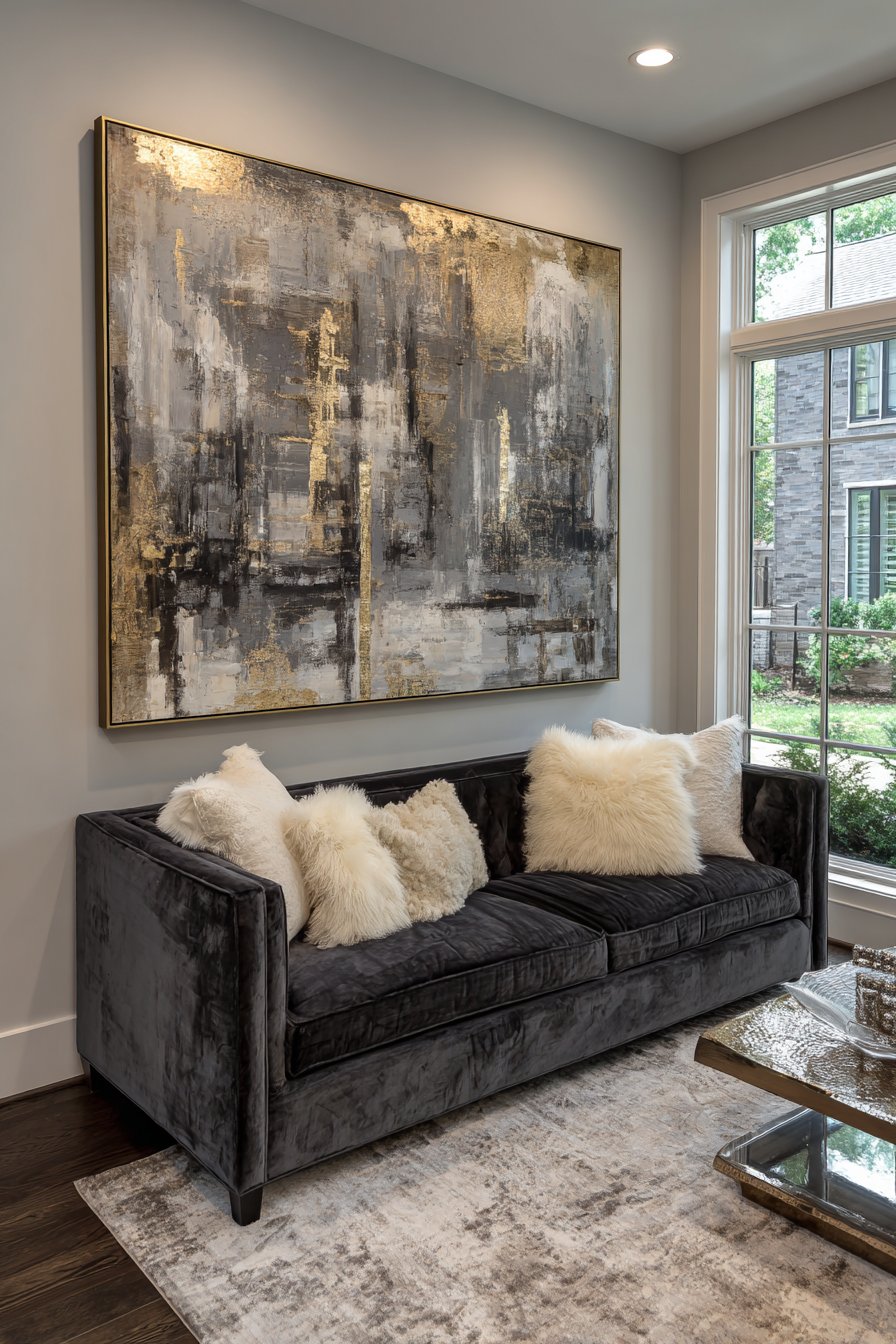 The charcoal grey velvet sofa beneath this dramatic artwork provides the perfect neutral foundation, allowing the warm tones of the painting to truly shine. This color relationship demonstrates an essential principle in interior design: pairing warm and cool tones creates dynamic visual tension that keeps a space feeling alive and engaging. The soft natural lighting from side windows plays across the canvas surface, revealing subtle variations in paint application and texture that change throughout the day, making the artwork feel like a living element within the room.