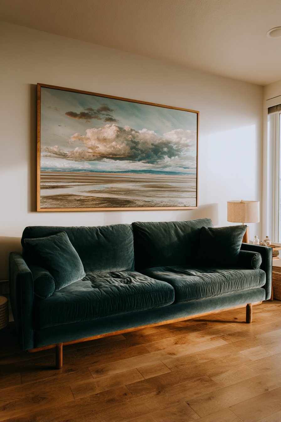 When selecting an oversized canvas, proportion becomes critical to success. The artwork should span approximately two-thirds to three-quarters of your sofa’s width, creating visual balance without appearing cramped or lost on the wall. An 8-inch gap between the sofa back and the bottom of the frame provides ideal breathing room, allowing both pieces to maintain their individual presence while working harmoniously together. The texture inherent in canvas paintings adds dimensional interest that photographs and prints simply cannot replicate.