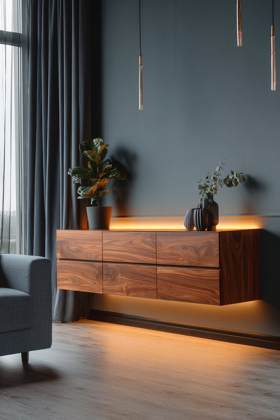 - Install floating shelves with heavy-duty mounting hardware rated for the combined weight of shelf and objects