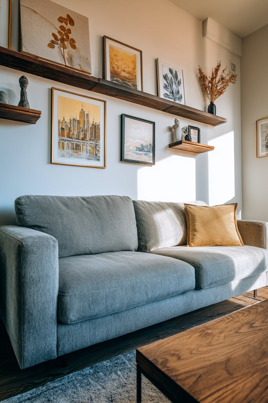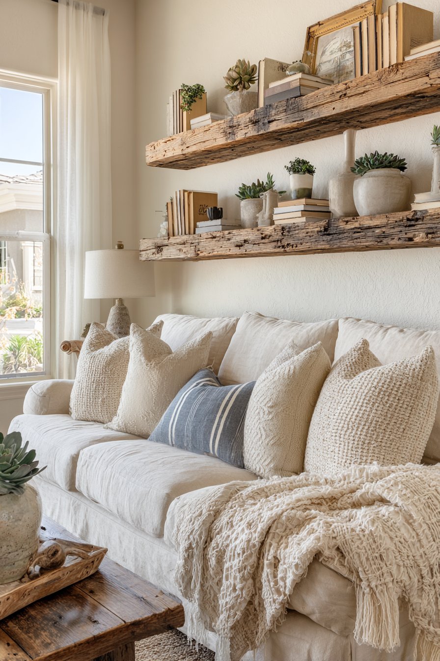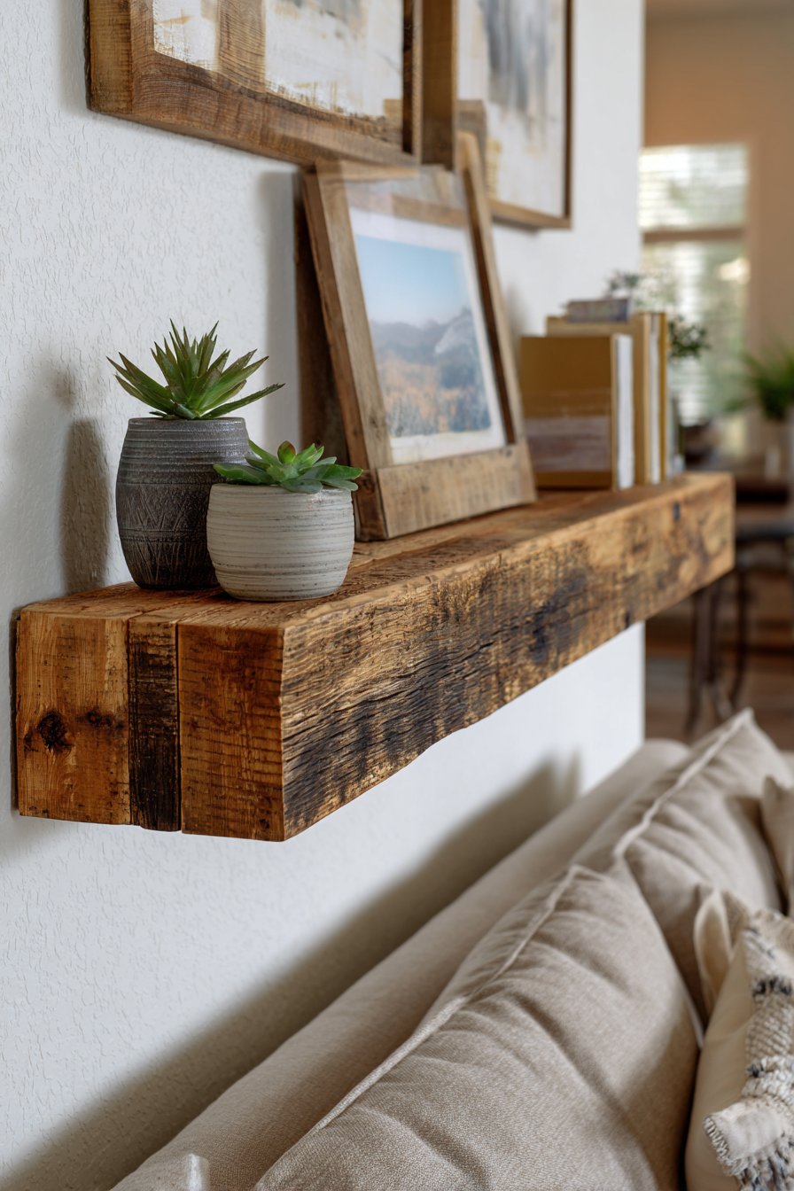 A reclaimed wood floating shelf transforms wall space into both decorative display and functional storage, embodying the popular trend toward multipurpose design elements. This 48-inch shelf, positioned 12 inches above the sofa, creates an accessible platform for curating a personal collection of objects that tell your story. The weathered wood grain showcasing natural color variations from honey to charcoal brings authentic character that cannot be replicated with new materials.