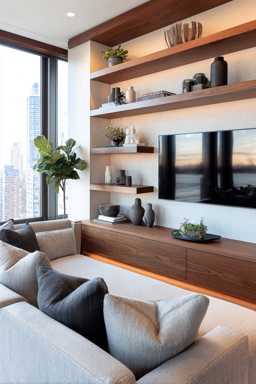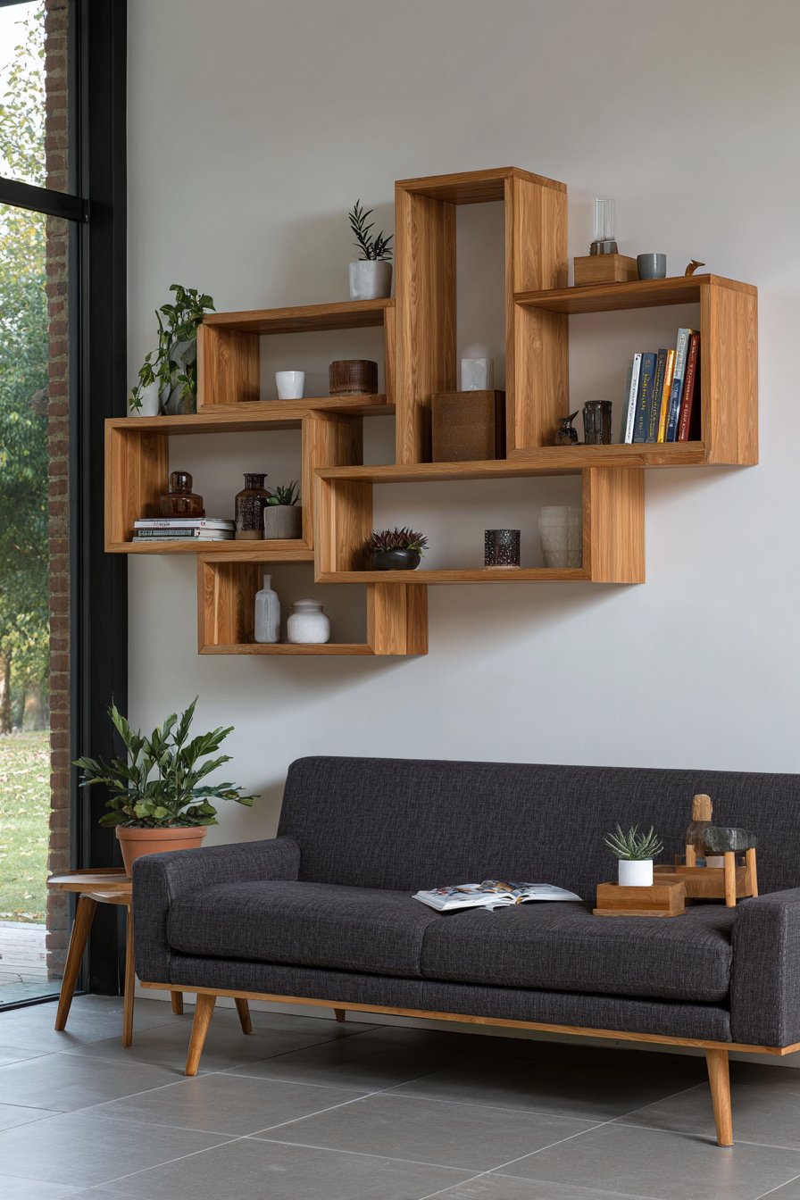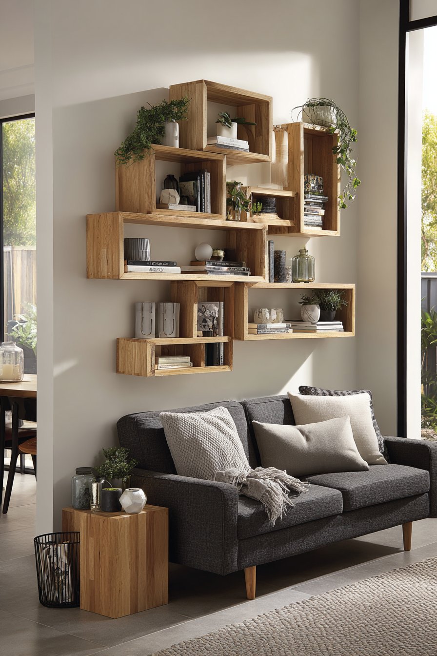 A reclaimed wood floating shelf transforms wall space into both decorative display and functional storage, embodying the popular trend toward multipurpose design elements. This 48-inch shelf, positioned 12 inches above the sofa, creates an accessible platform for curating a personal collection of objects that tell your story. The weathered wood grain showcasing natural color variations from honey to charcoal brings authentic character that cannot be replicated with new materials.