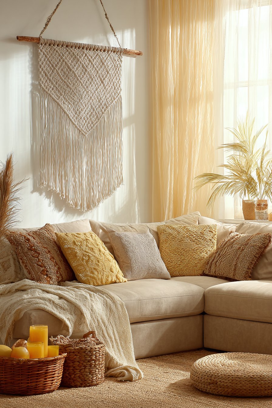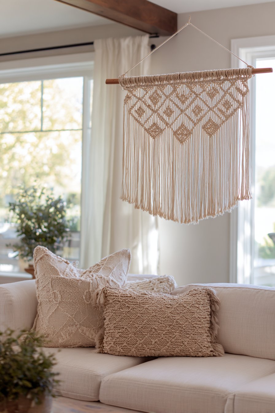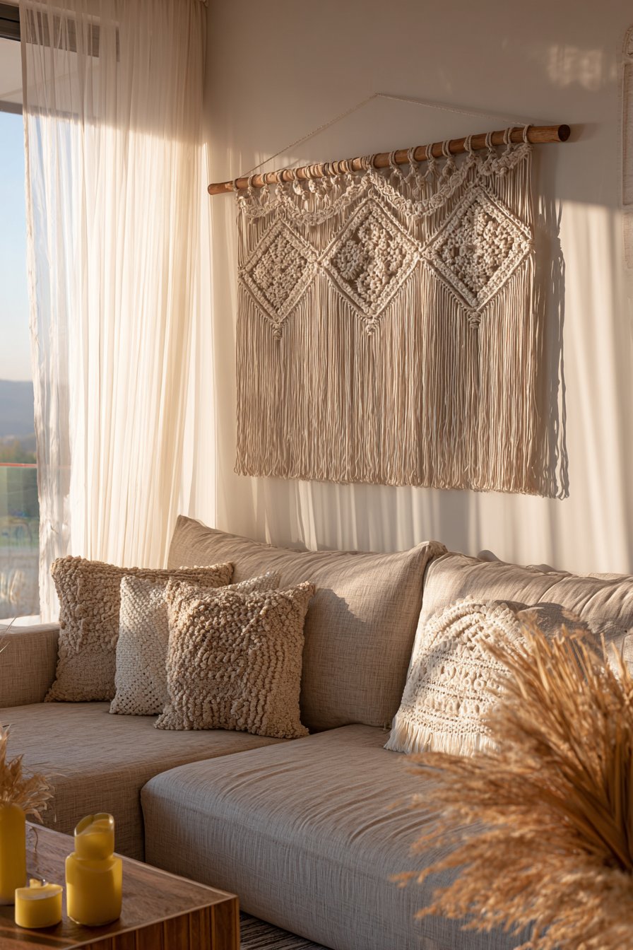 Suspended from a wooden dowel and positioned above a low-profile beige sectional with woven texture throw pillows, this arrangement creates layers of complementary textures that define bohemian style. The key to successful boho design lies in mixing various textile techniques—the smooth linen sofa, nubby woven pillows, and intricate macramé knotwork each contribute distinct tactile qualities. The overall effect feels collected, comfortable, and personally curated rather than designed by formula.