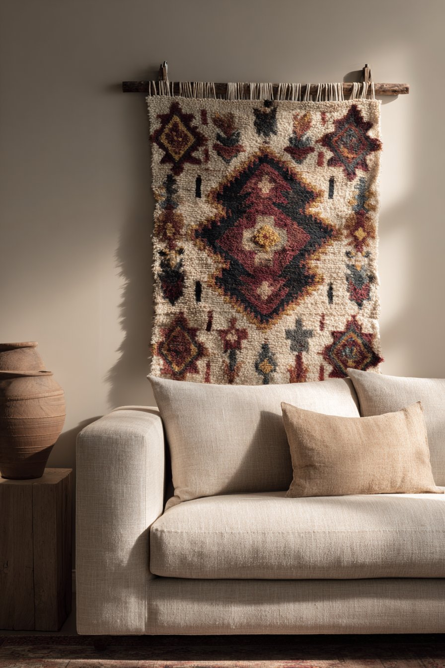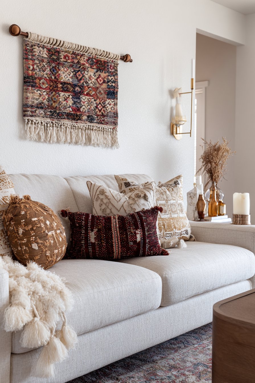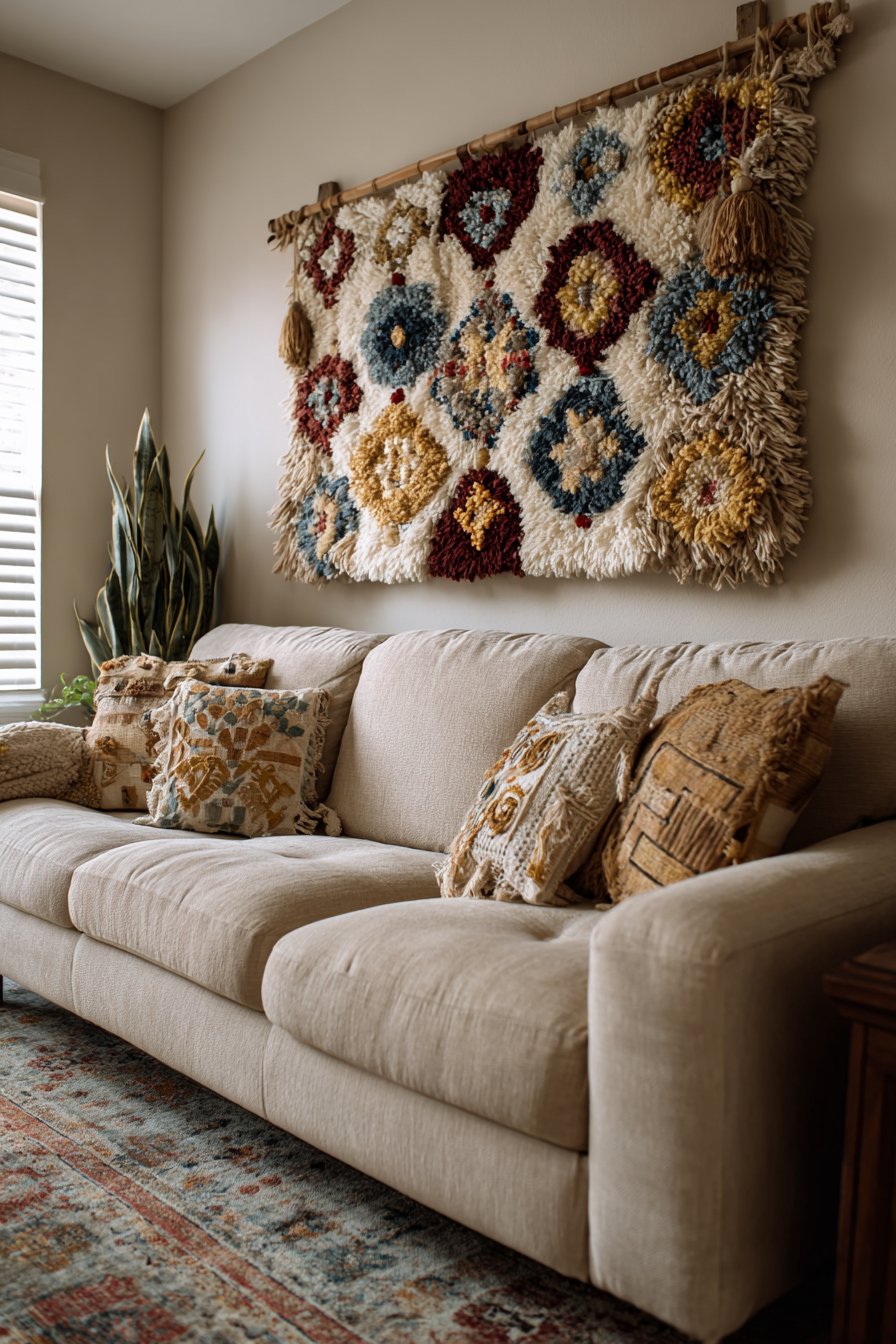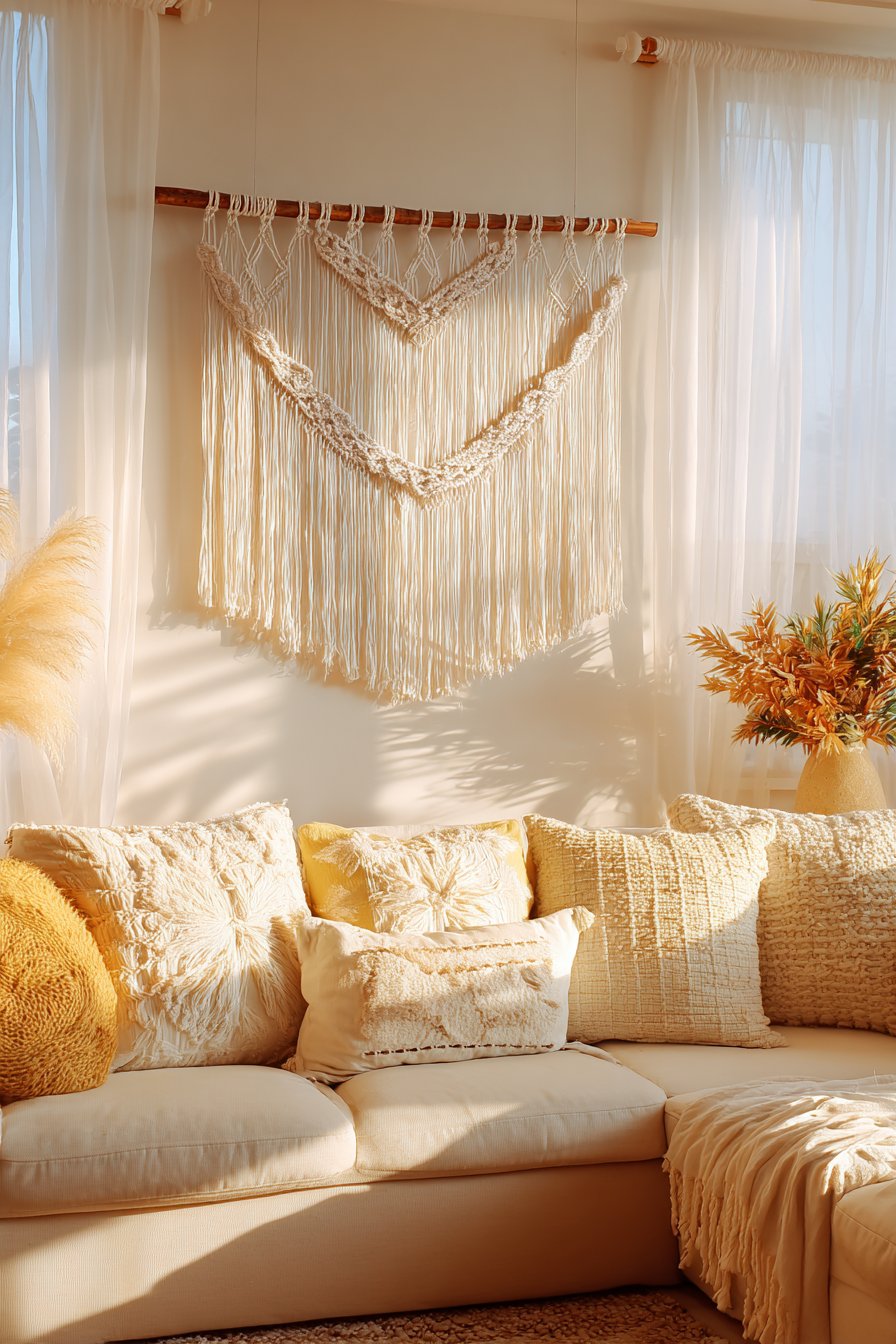 Suspended from a wooden dowel and positioned above a low-profile beige sectional with woven texture throw pillows, this arrangement creates layers of complementary textures that define bohemian style. The key to successful boho design lies in mixing various textile techniques—the smooth linen sofa, nubby woven pillows, and intricate macramé knotwork each contribute distinct tactile qualities. The overall effect feels collected, comfortable, and personally curated rather than designed by formula.
