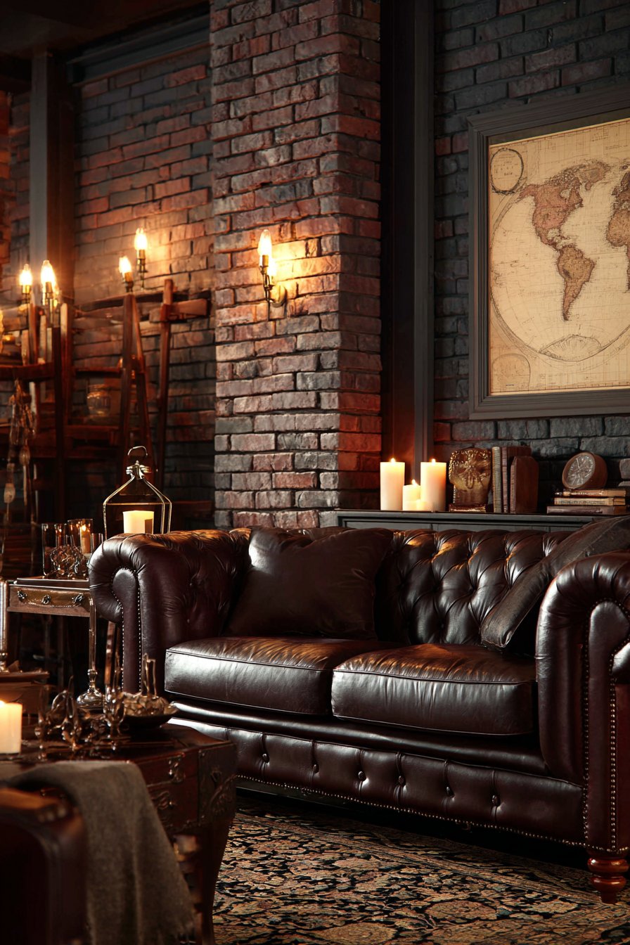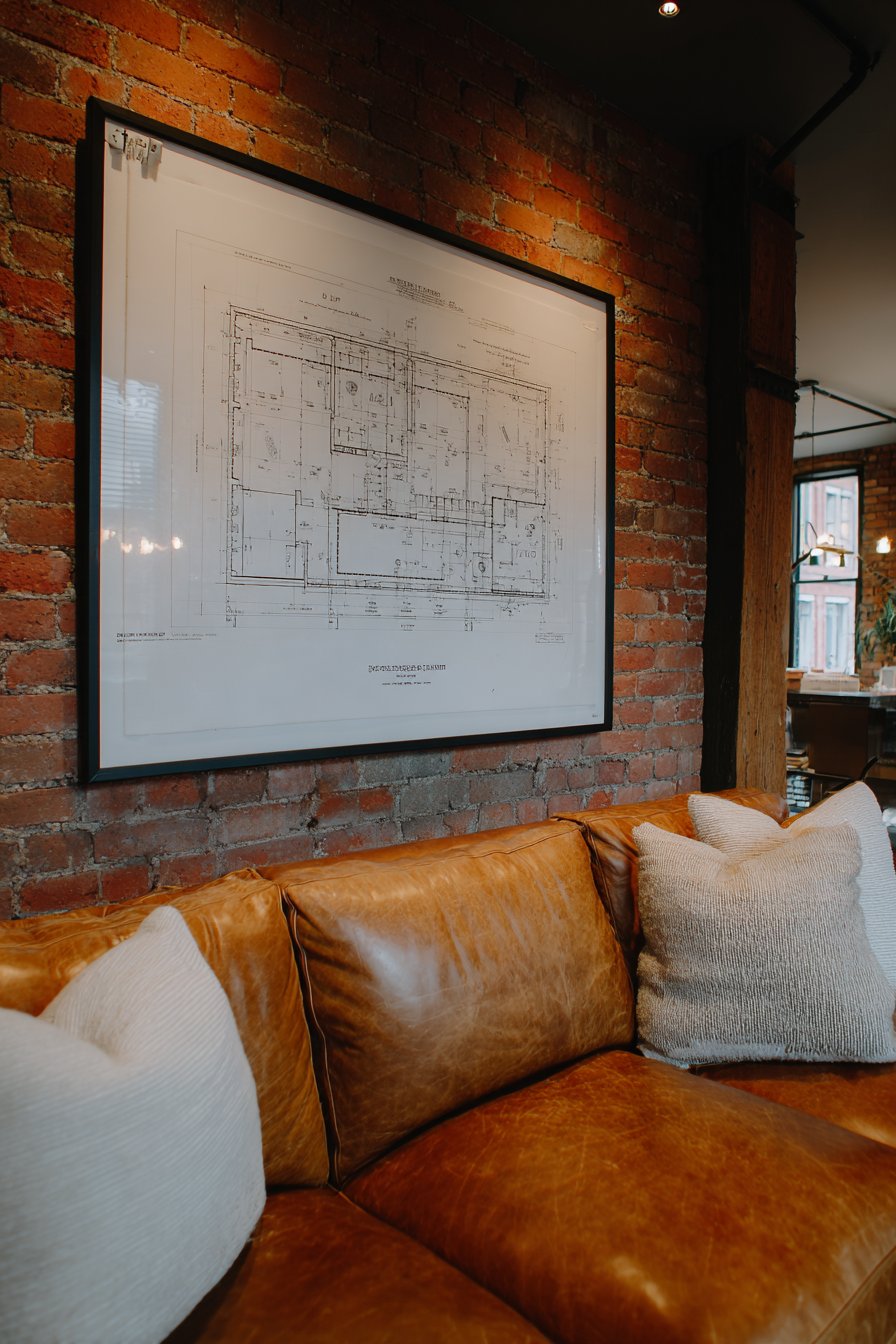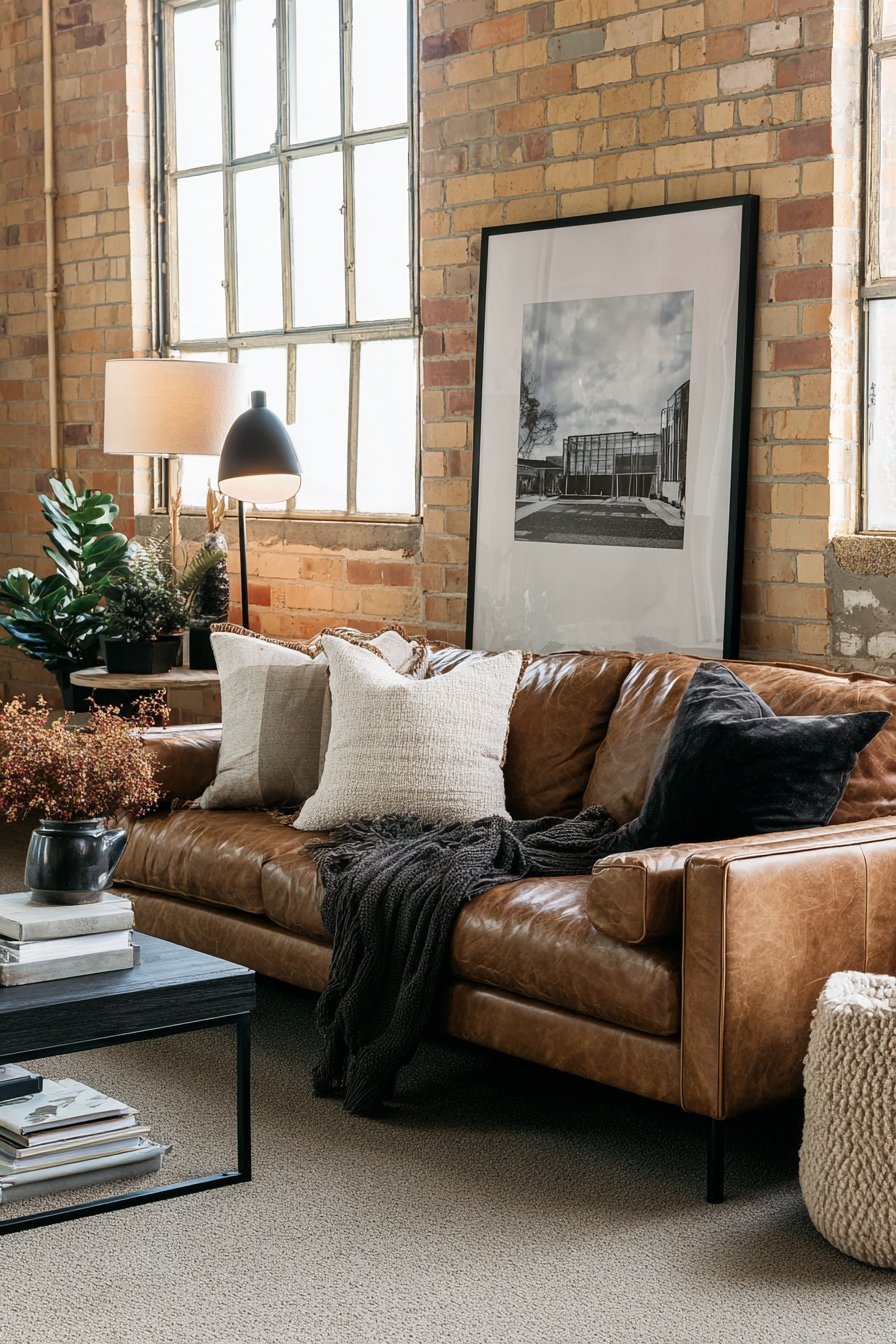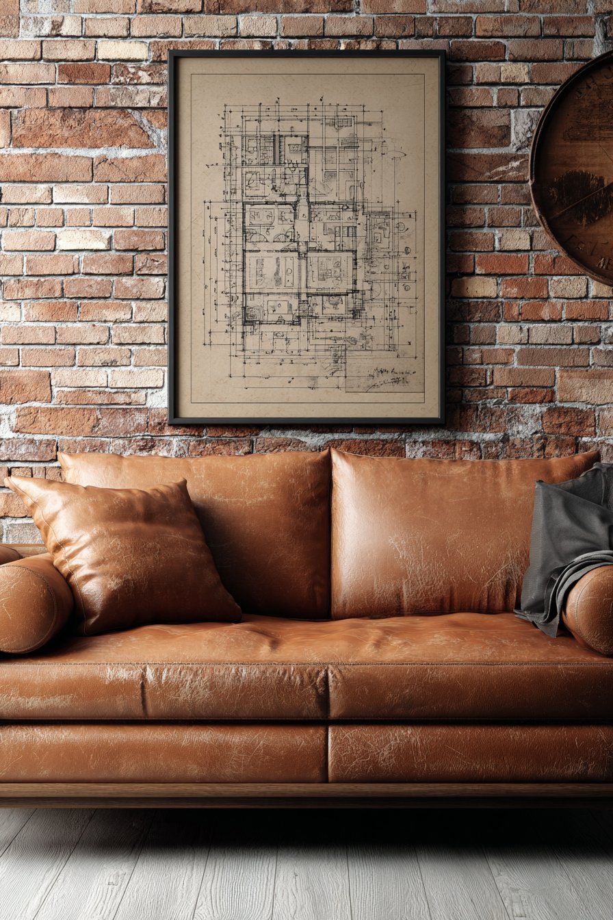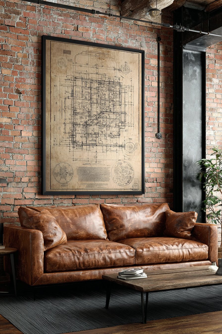 Positioned 10 inches above a cognac leather sofa with visible grain texture, this arrangement creates cohesive material story of aged leather and vintage paper that both improve with time. The exposed brick accent wall visible in the surrounding space reinforces the urban loft aesthetic where industrial elements and raw materials celebrate building structure rather than concealing it. This design approach originated in converted warehouse and factory spaces where architectural bones became celebrated features.