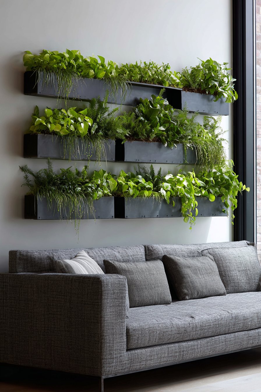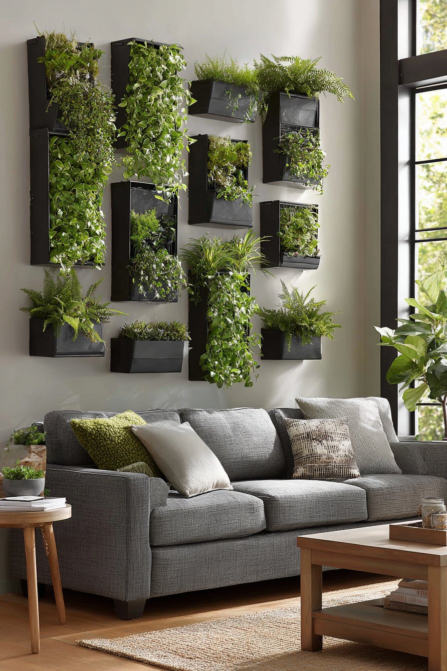 A vertical garden system with mounted planters creates living wall feature that brings biophilic design principles to contemporary living spaces. The matte black metal planters arranged in staggered pattern across 36 inches wide and 48 inches tall transform wall space into thriving ecosystem. The trailing pothos, philodendrons, and ferns create organic movement and natural beauty that no static artwork can replicate.