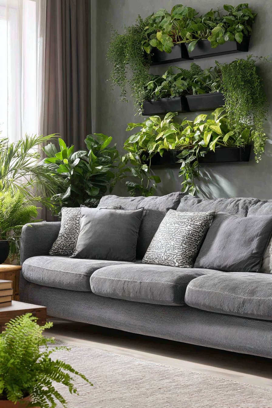 The living nature of this installation means it evolves continuously as plants grow, creating ever-changing composition. Natural moisture and organic growth patterns add authentic life to the space, improving air quality while providing daily connection to nature. Positioned 12 inches above a grey linen sofa, the vertical garden creates dramatic focal point while the neutral upholstery prevents visual competition with the varied green tones.