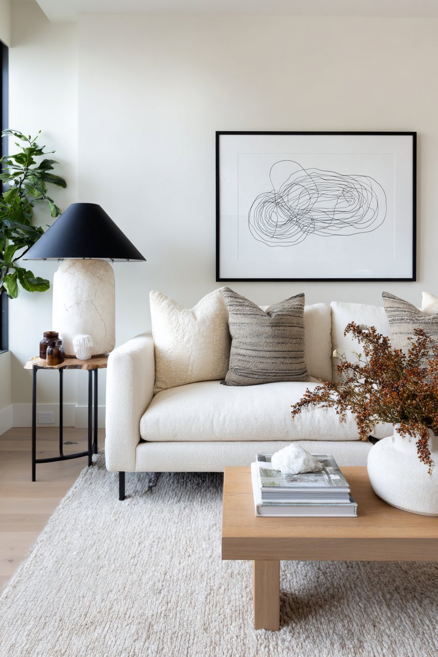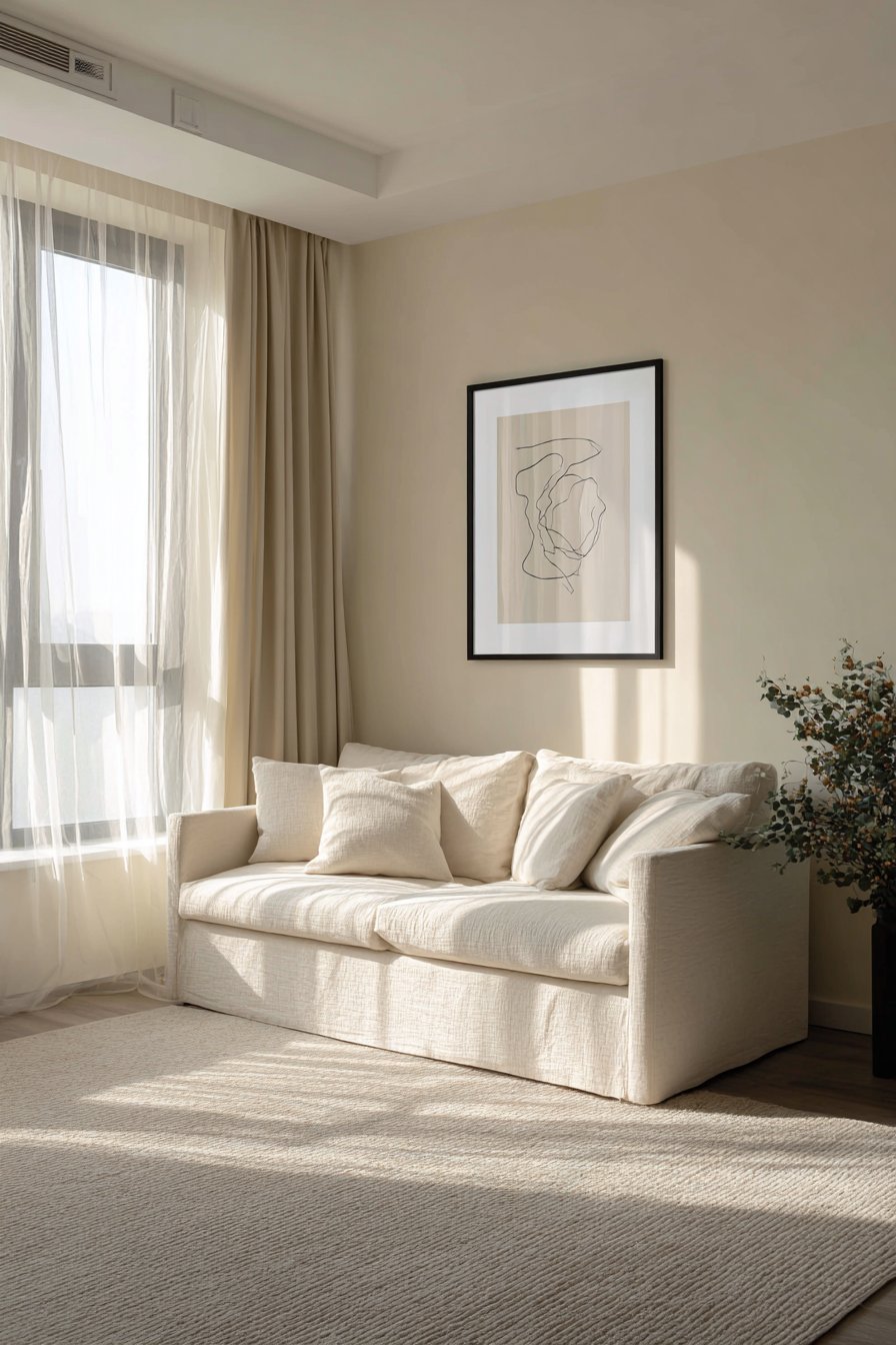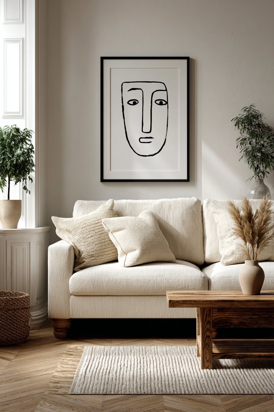 The simple composition creates breathing room for the mind, avoiding visual clutter that can feel overwhelming in busy modern life. Centered 9 inches above a cream-colored sofa with clean modern lines, the artwork reinforces the room’s commitment to minimal aesthetic while adding personality through artistic expression. The balanced interior lighting with natural daylight creates even exposure that showcases the artwork’s elegant simplicity.