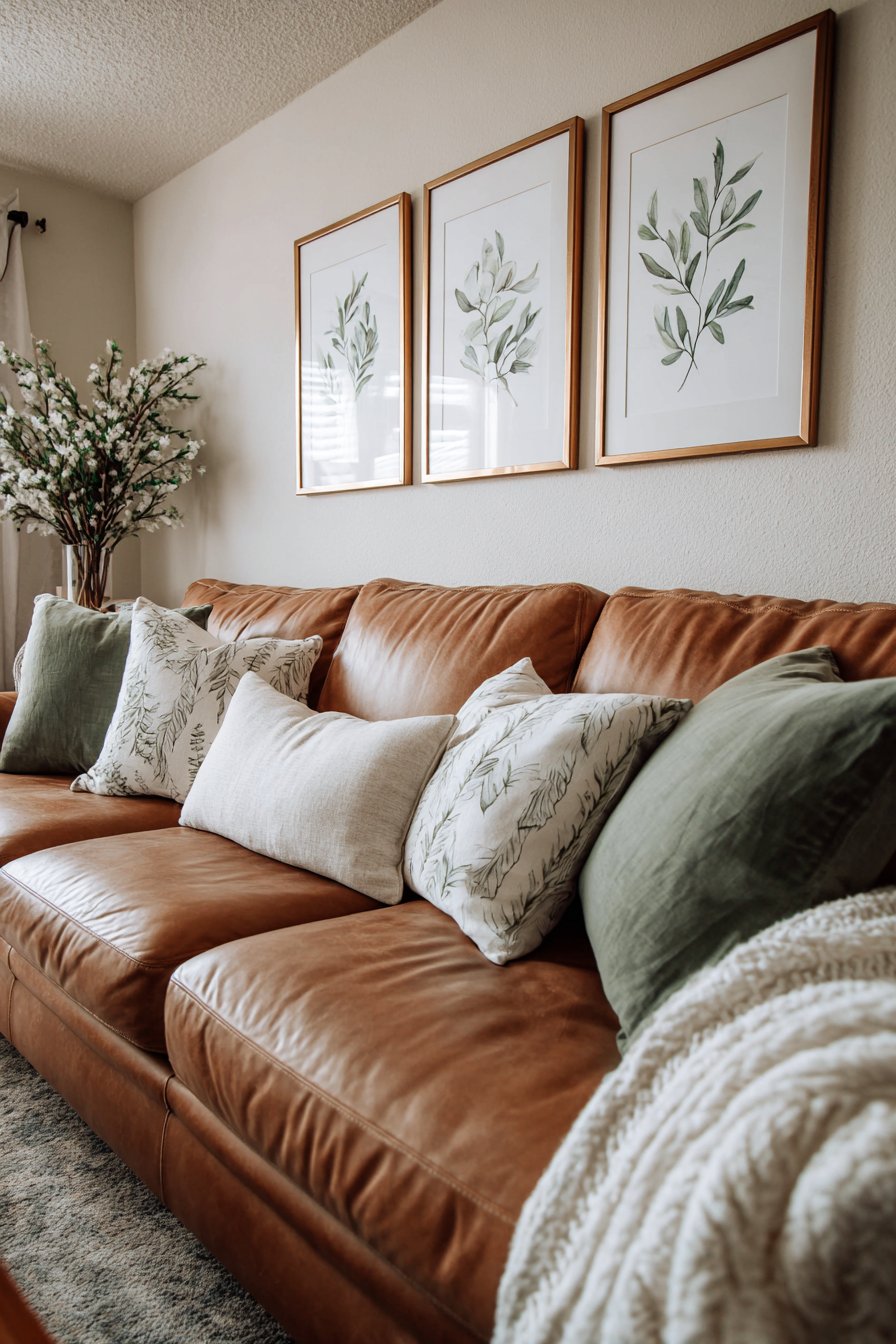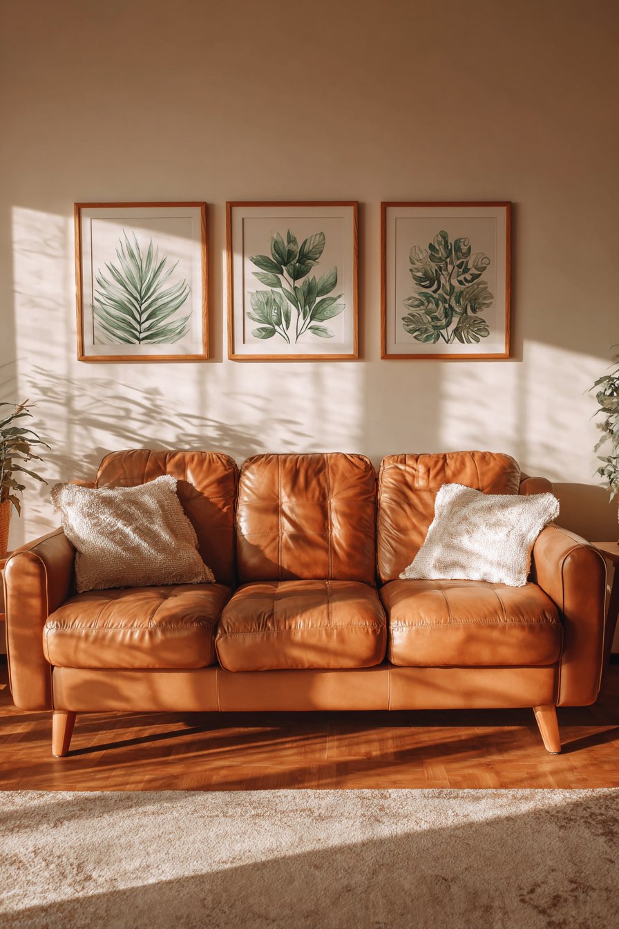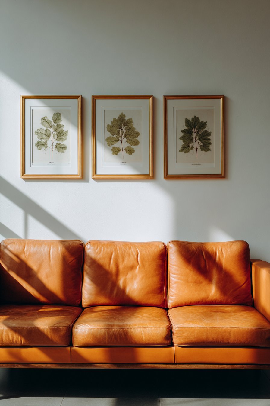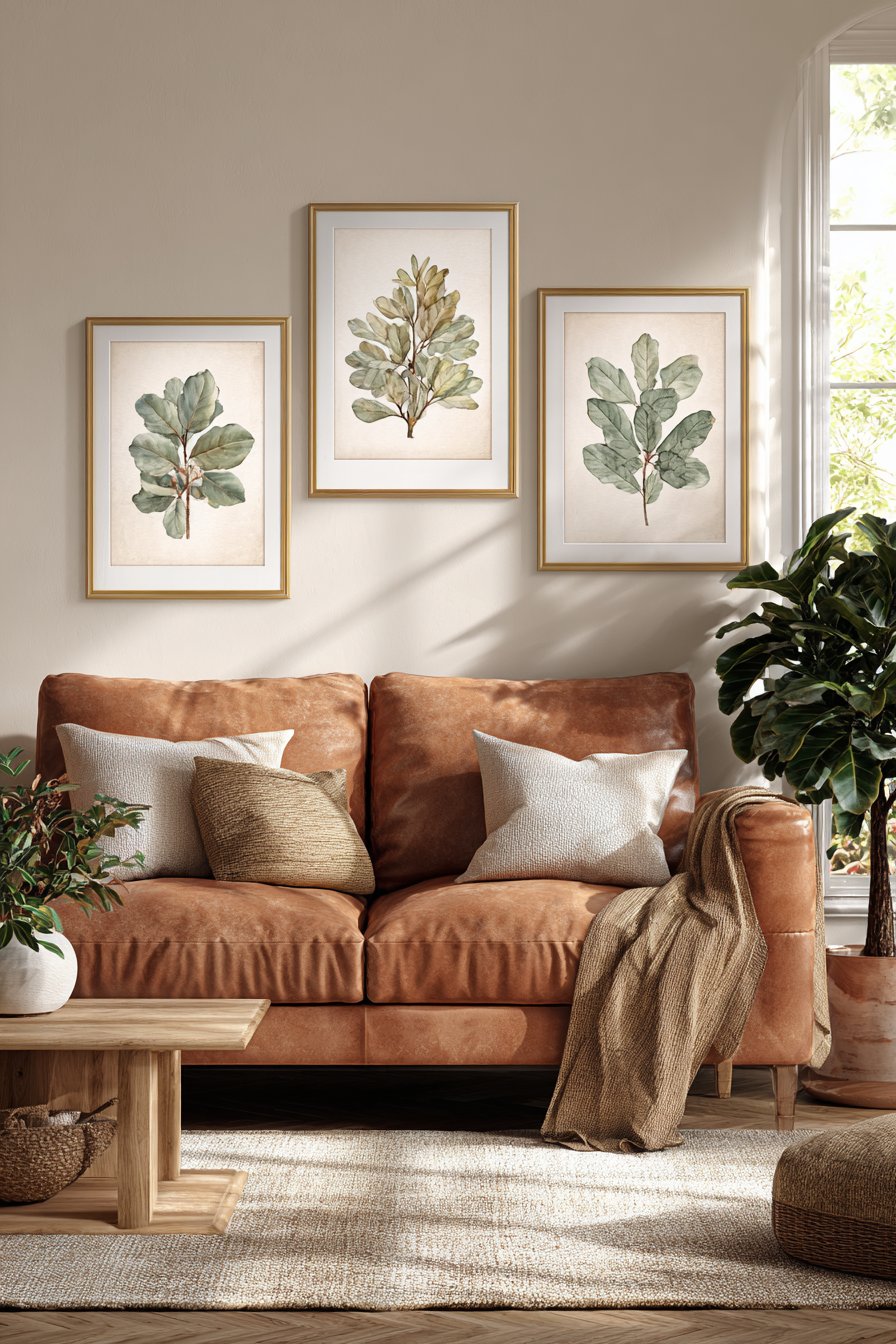 The camel-colored leather sofa beneath these prints provides a sophisticated neutral backdrop that allows the botanical artwork to command attention. Leather furniture brings its own textural interest to the space, and its warm honey tones create a harmonious relationship with the gold frame accents. As natural light moves across this arrangement throughout the day, the gentle shadows behind each frame add subtle dimension, transforming what could be a flat wall into a dynamic surface with depth and character.