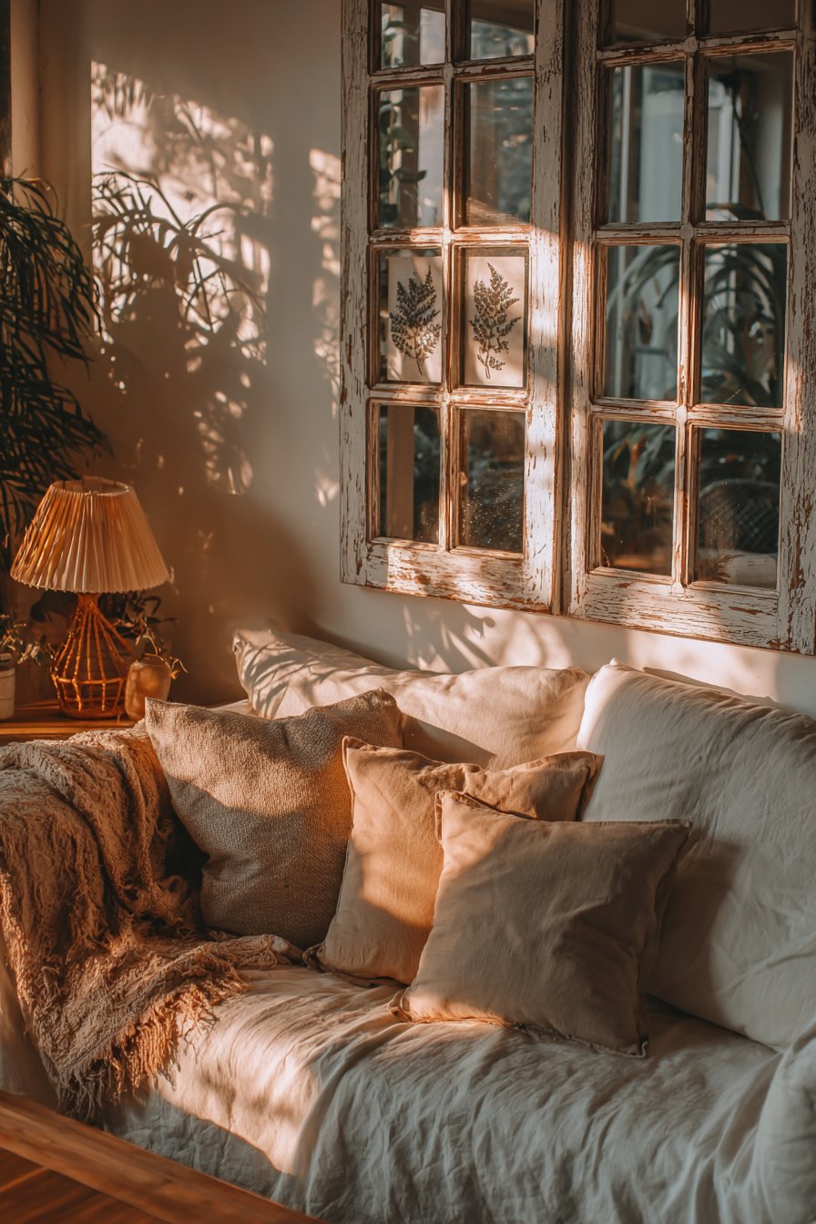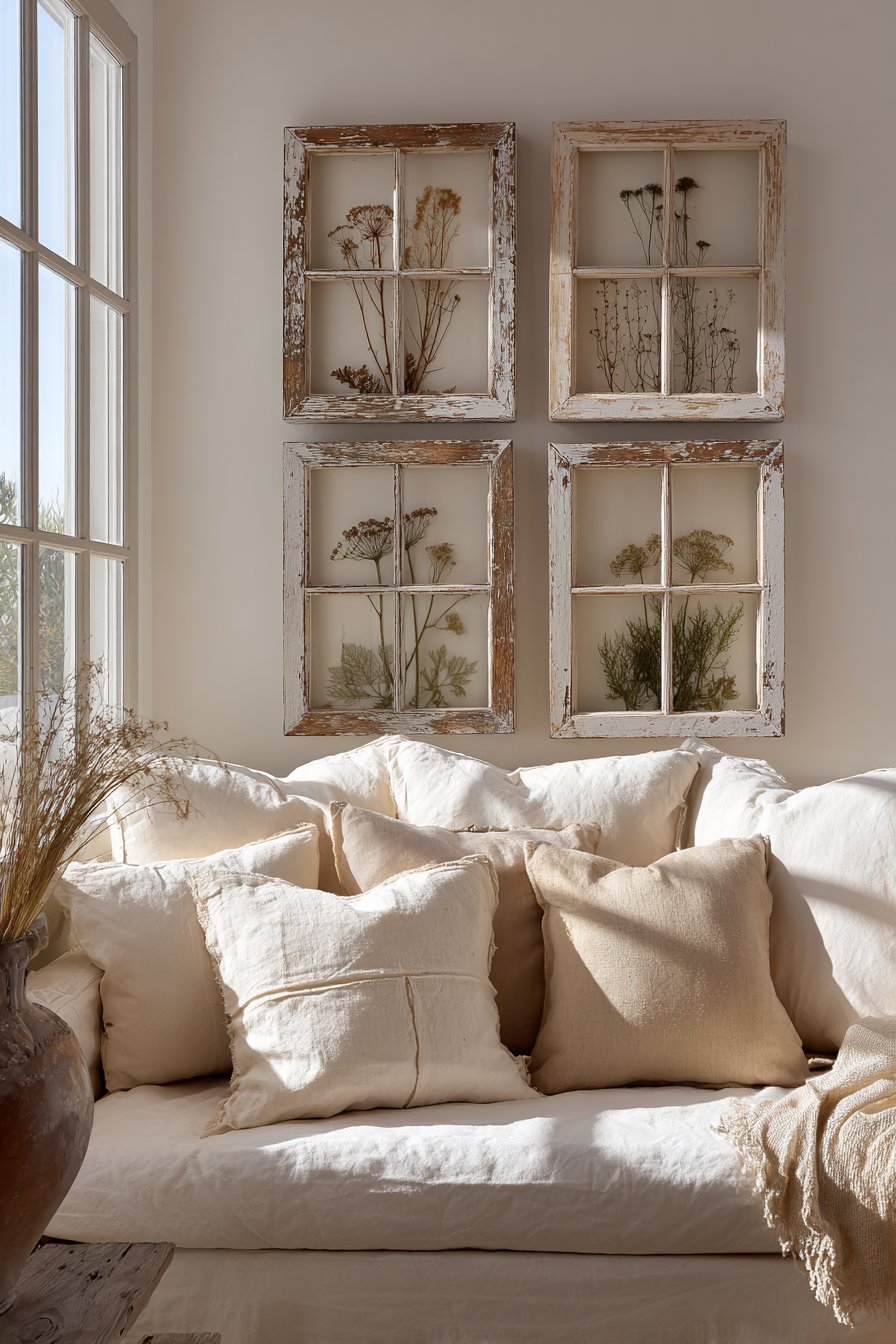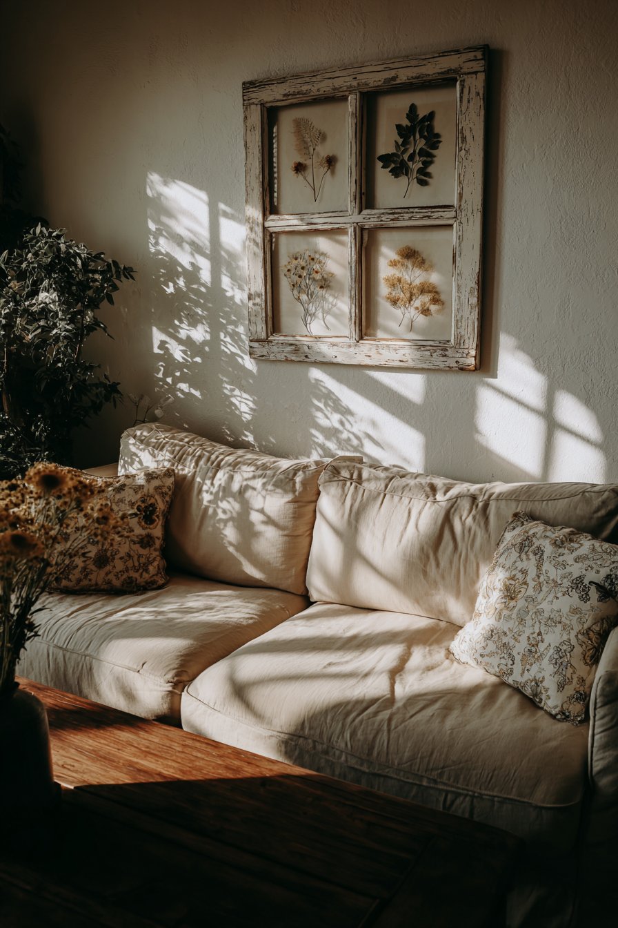 Positioned 10 inches above a farmhouse-style sofa in natural linen, this arrangement embodies shabby-chic aesthetic where imperfection adds character and authenticity matters more than pristine condition. The soft natural lighting creates shadows through the window frame structure, adding dimensional interest that changes throughout the day. The pressed botanicals provide nature-inspired decoration that references traditional herbarium displays and botanical study.