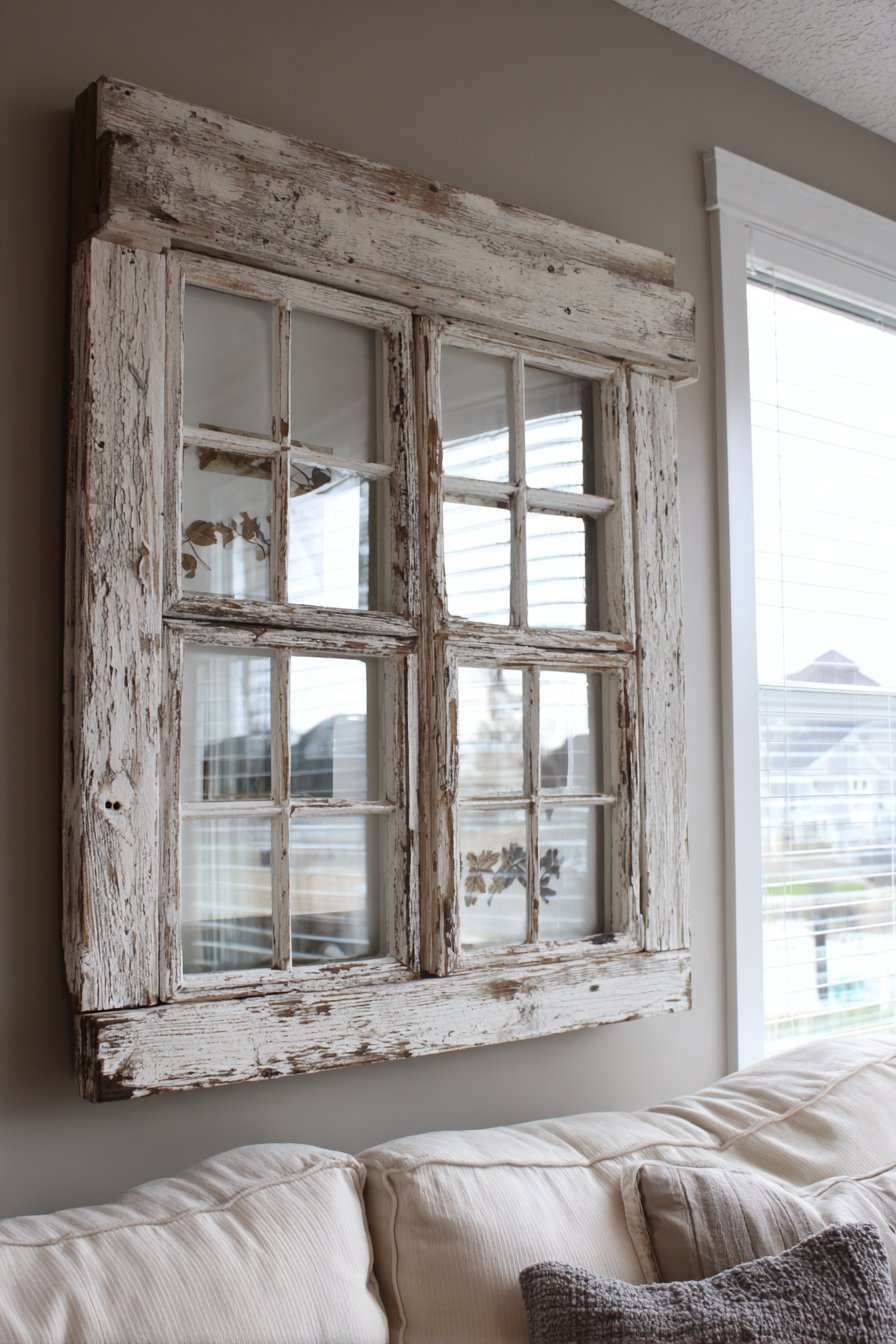 A rustic window frame repurposed as wall decor celebrates sustainable design and architectural salvage. The 36×48-inch vintage frame with original weathered white paint and authentic patina tells story of previous life while finding new purpose as decorative element. The four panes containing pressed botanical specimens under glass transform the salvaged window into curated display that bridges past and present.