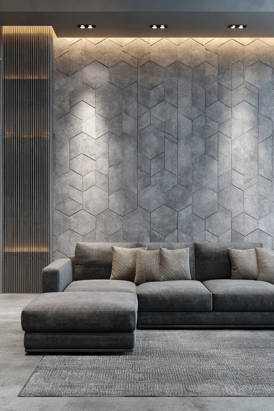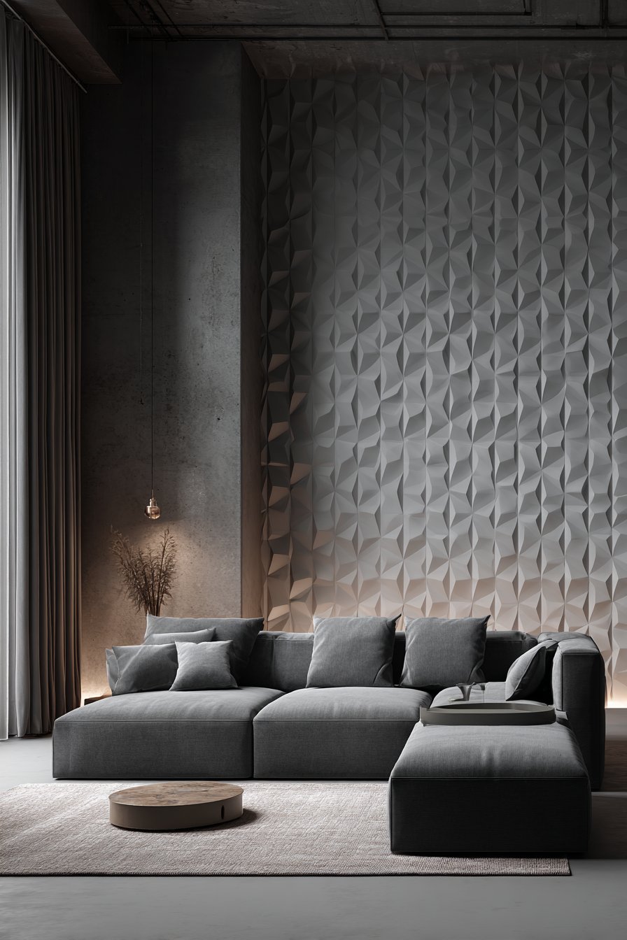 Mounted 8 inches above a charcoal sectional sofa, this installation demonstrates how textured wall treatments add visual interest in minimalist contemporary living rooms where color palettes remain neutral. Directional lighting emphasizes the dimensional relief and subtle color variations, transforming what could be monotonous grey into dynamic surface with depth. The architectural quality elevates this beyond mere decoration into permanent room feature.