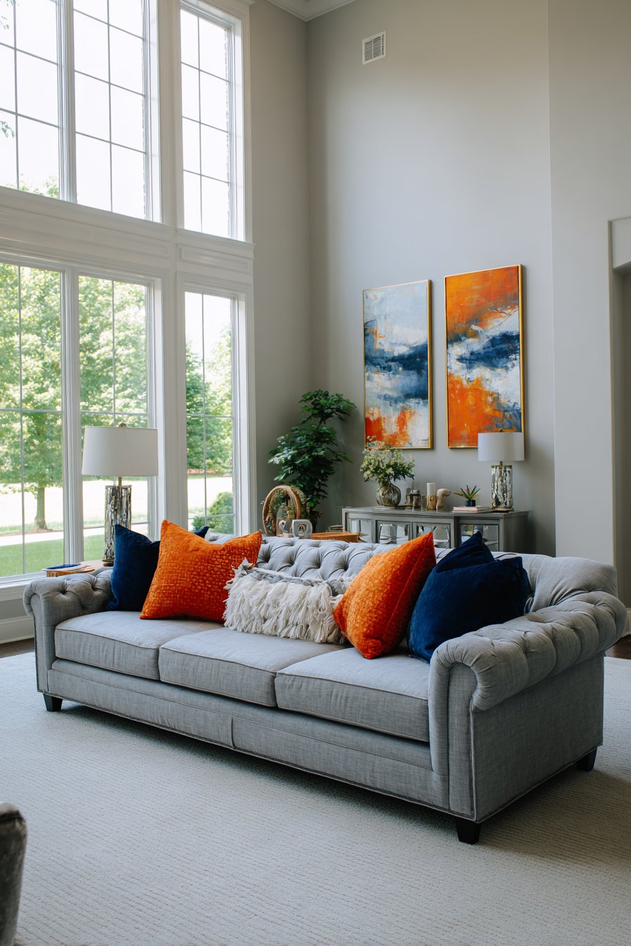 The vertical orientation provides visual lift, drawing the eye upward and making standard ceiling heights feel more generous. Positioned 9 inches above a grey upholstered sofa with tufted back detail, the vibrant artwork provides dramatic color contrast against the neutral foundation. The natural daylight from large windows creates even illumination across both pieces, ensuring the bold colors appear true and saturated throughout the day.