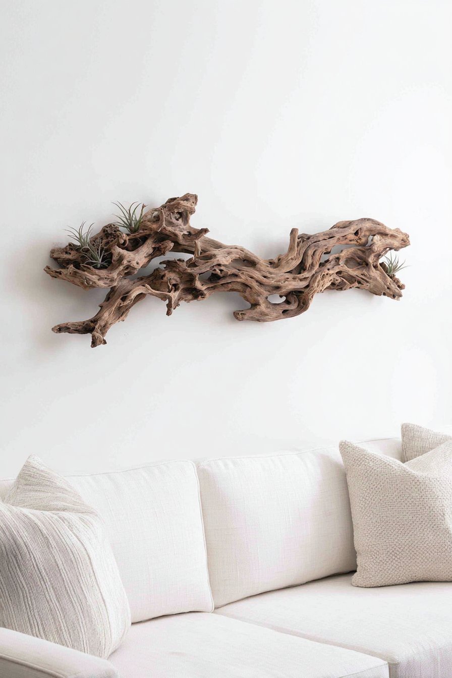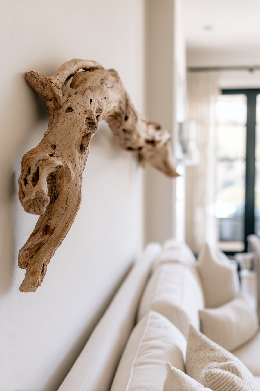 Positioned 11 inches above a white linen sofa, this installation creates serene coastal-organic atmosphere where natural materials and simple beauty take precedence. The soft natural lighting highlights the three-dimensional form and surface details worn smooth by water and time. The authentic weathering cannot be replicated—each piece of driftwood carries unique story written in its grain patterns and sculptural form.