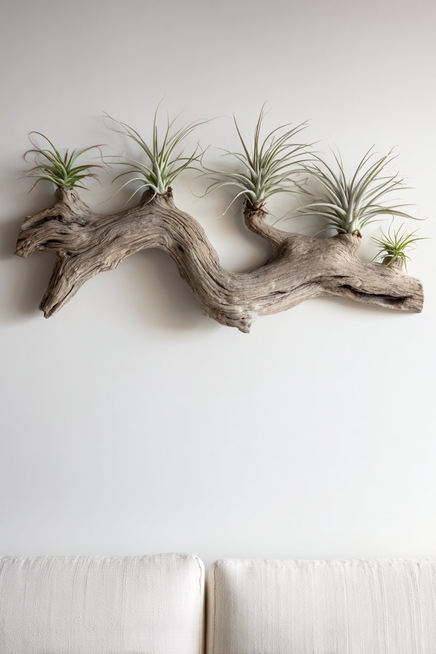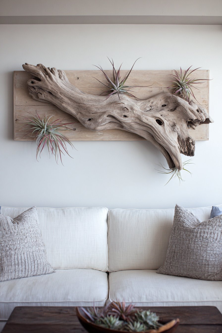 A long horizontal piece of driftwood mounted as natural sculptural art brings organic beauty and coastal inspiration to living spaces. The 60-inch weathered wood showing authentic grey-brown patina with organic curves and natural texture variations creates one-of-a-kind focal point that celebrates nature’s artistry. Small air plants nestled in natural crevices along the wood add living elements that enhance the organic aesthetic.