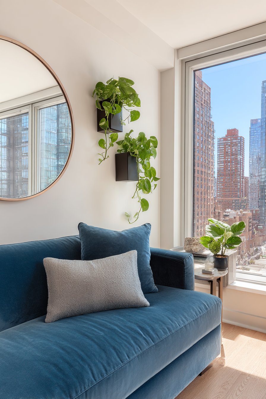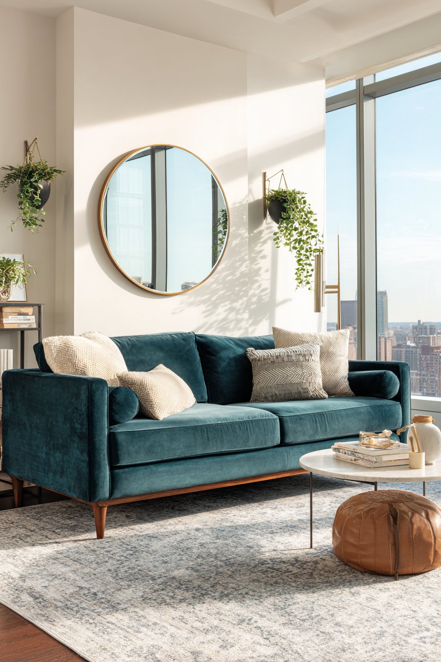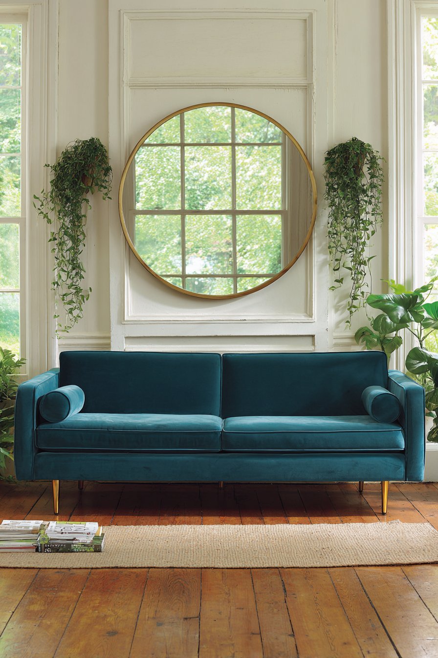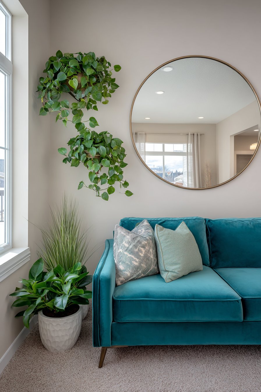 The mid-century modern teal velvet sofa provides a bold color foundation that the brass mirror frame beautifully complements. This pairing exemplifies the principle of metallic accents bridging different color temperatures—the warm brass creates harmony with both cool teal upholstery and warmer wood tones elsewhere in the room. The two small wall-mounted planters flanking the mirror at asymmetrical heights prevent the arrangement from feeling too rigid while introducing organic elements that soften the overall composition.