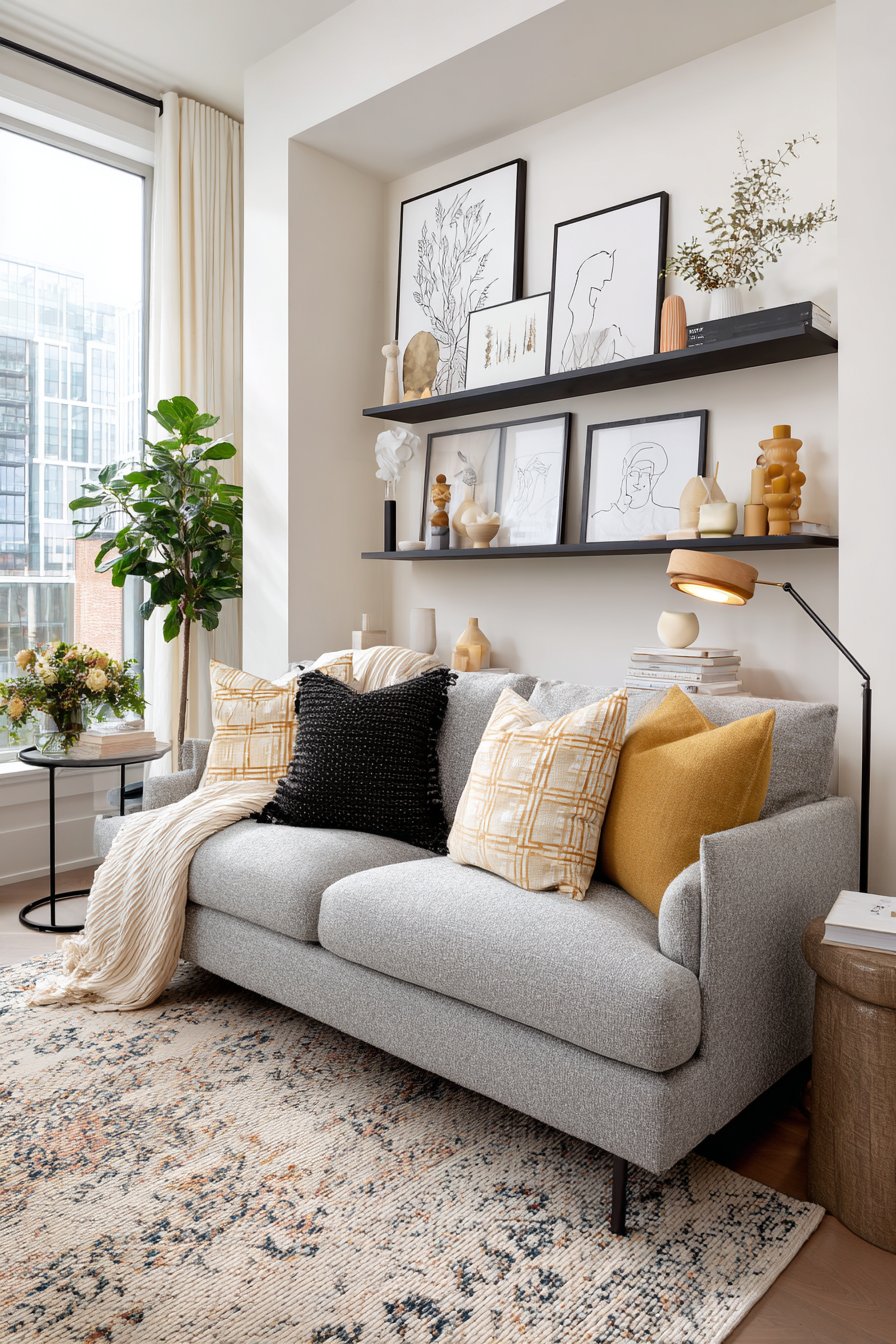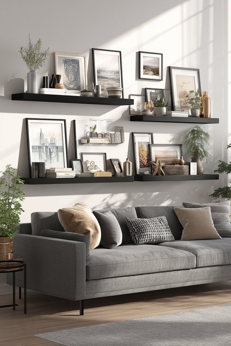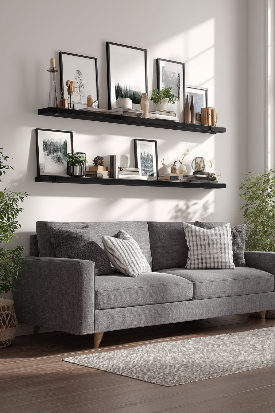 Positioned above a grey fabric sofa with clean modern lines, this system maintains contemporary aesthetic while offering practical functionality. The matte black finish provides strong definition without competing with displayed items for attention. As you build your art collection over time, the ledge system grows with you, accommodating new purchases without requiring new picture hanging calculations or additional wall damage. This makes it ideal for renters or anyone who enjoys frequently updating their decor.