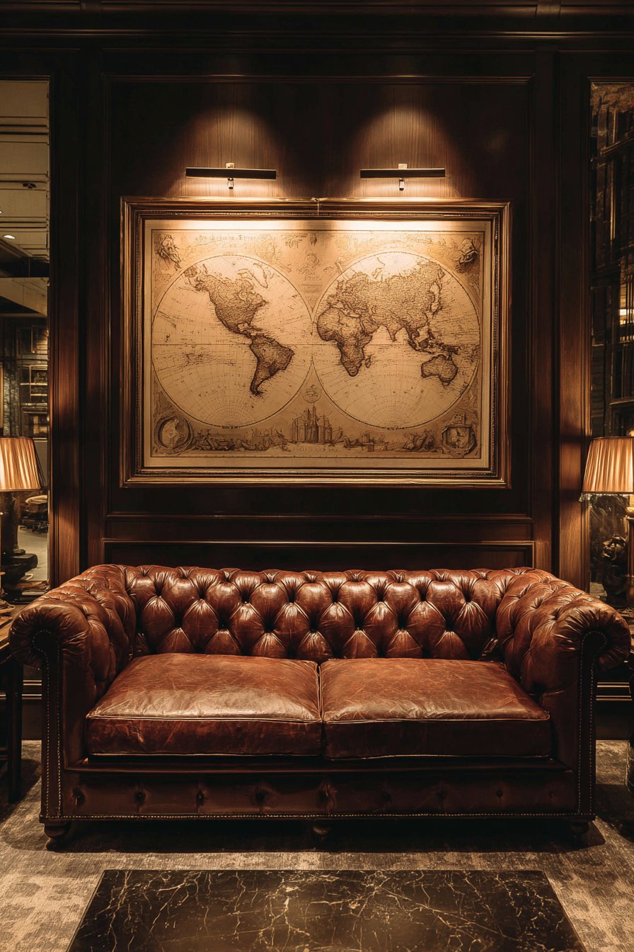 Positioned above a brown leather Chesterfield sofa, this arrangement creates a classic study-like atmosphere reminiscent of private libraries and gentlemen’s clubs. The relationship between aged leather upholstery and vintage cartography feels natural and uncontrived, as both materials improve with age and tell stories through their patina. Warm ambient lighting from nearby table lamps creates subtle highlights along the frame’s texture while avoiding harsh glare on the map’s surface, crucial for viewing the intricate geographic details.