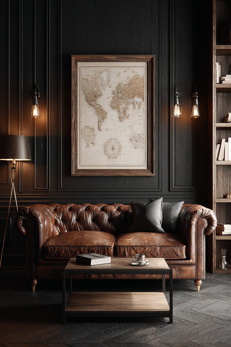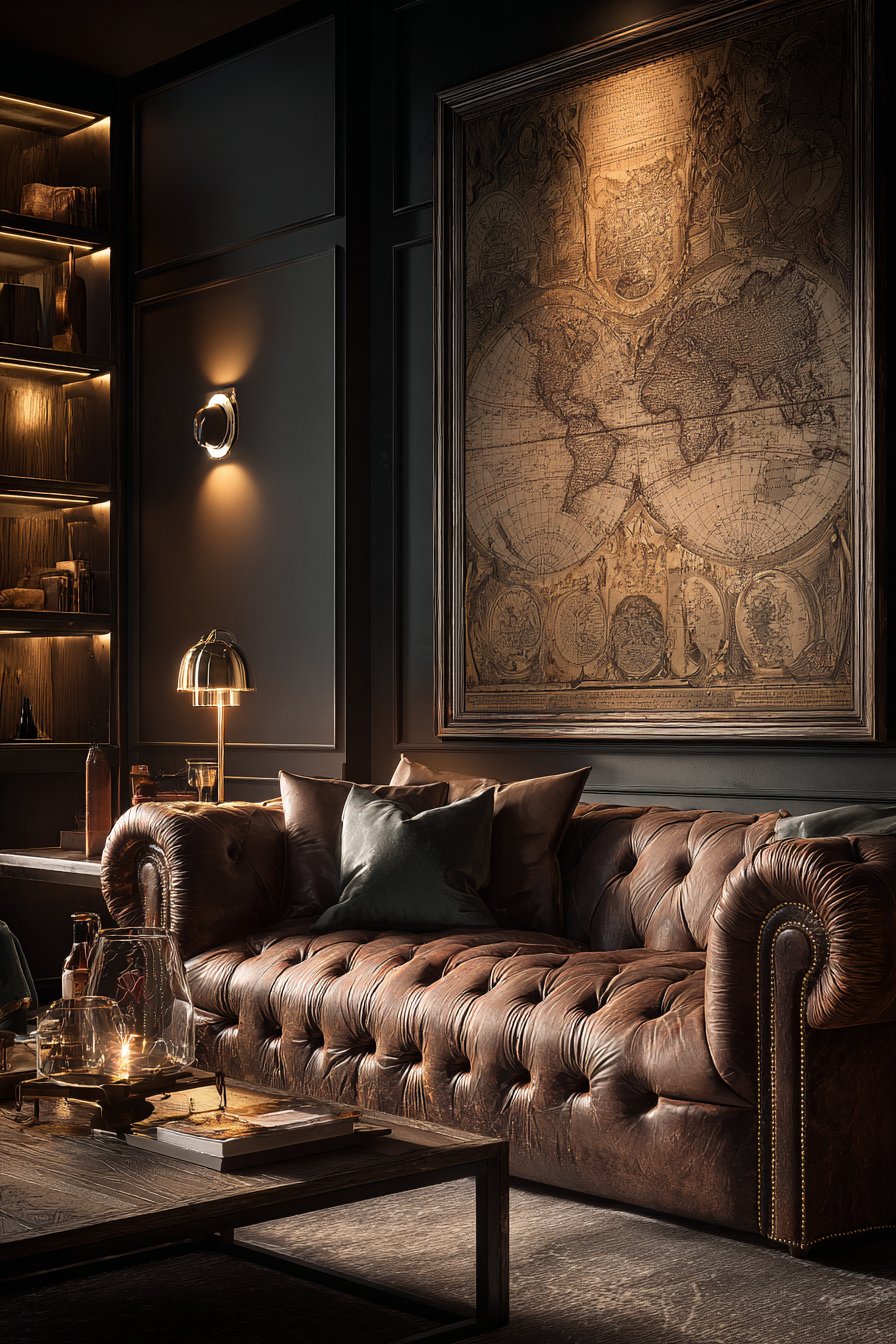 - Pair cartographic prints with leather furniture for classic scholarly aesthetic