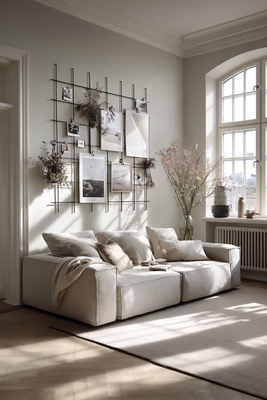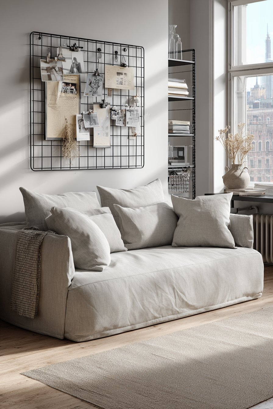 A metal grid wall organizer transforms functional display into artistic arrangement, perfectly suited to Scandinavian-minimalist aesthetics that prize both beauty and utility. The matte black grid measuring 48×36 inches provides structured framework for an ever-changing collection of polaroid photos, art prints, and small dried flower bundles attached with simple clips. This system embodies the Scandinavian principle of “lagom”—having just the right amount, neither too much nor too little.