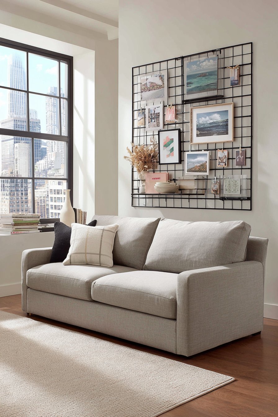 Mounted 9 inches above a light grey linen sofa, the black grid provides strong graphic definition against pale walls while the displayed items introduce color and personality. Natural diffused daylight from large windows creates soft shadows through the grid pattern, adding subtle dimensional interest throughout the day. The clean lines and geometric precision of the grid system provide structure that prevents the rotating display of personal items from appearing disorganized or chaotic.