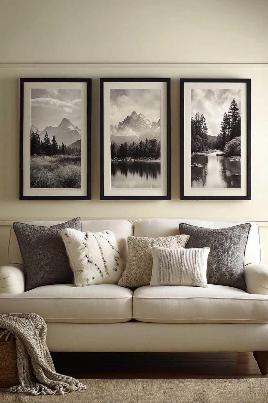 A triptych of black and white landscape photographs creates sophisticated focal point through the power of cohesive series presentation. Each 20×30-inch vertically oriented panel works both independently and as part of the larger composition, depicting serene nature scenes—mountains, forests, and lakes—that create narrative flow across the wall. The monochromatic palette ensures the three images work harmoniously together while allowing viewers to appreciate the unique character of each individual scene.