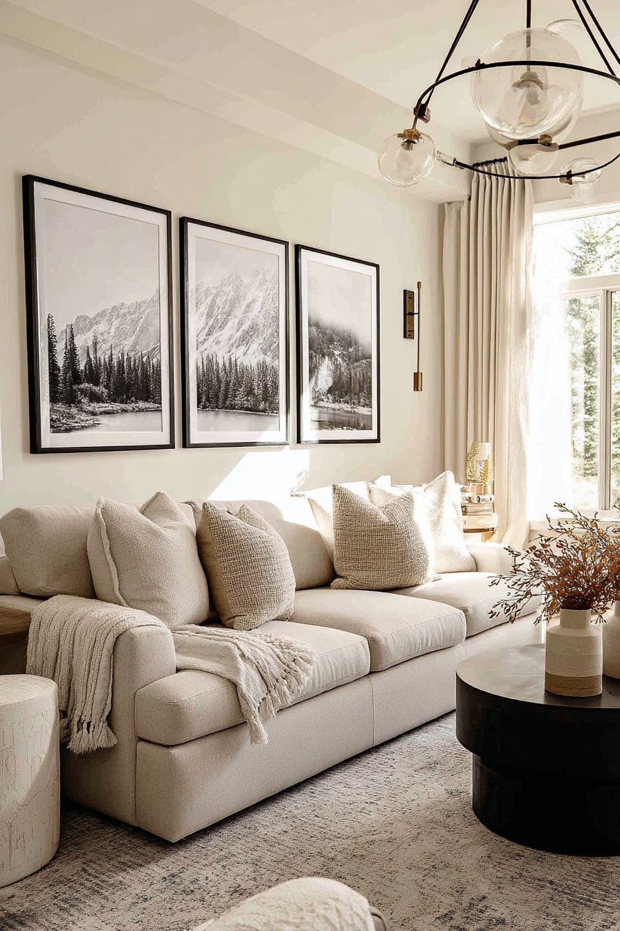 Positioned above a cream-colored sofa with neutral throw pillows, this monochromatic artwork prevents color competition while introducing tonal variation through the grey scale of the photographs. The balanced interior lighting creates even exposure across all three frames, crucial for maintaining the integrity of the triptych effect. This approach particularly suits contemporary and transitional spaces where clean lines and editing create sophisticated restraint.