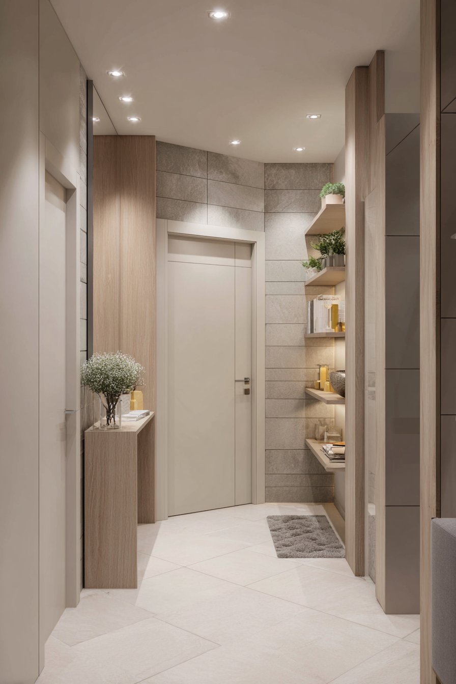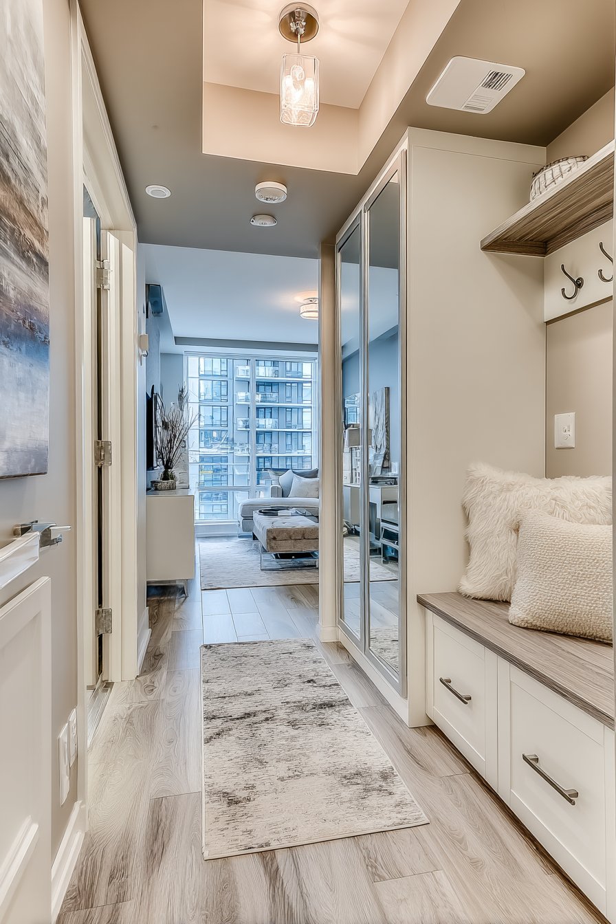 Key Design Tips: Install tall, shallow cabinets to maximize storage capacity without reducing walkway clearance in narrow entryways. Choose louvered cabinet doors to add texture and visual interest while maintaining a light, airy appearance. Incorporate open niches at functional heights within closed storage systems for frequently accessed items. Select brushed nickel or chrome hardware for refined contemporary detailing. Position full-length mirrors adjacent to storage systems for convenient before-leaving appearance checks.