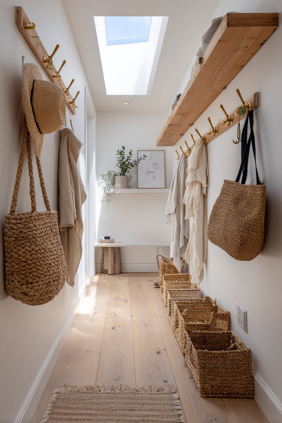 Key Design Tips: Select floating shelves no deeper than 10-12 inches to maintain adequate walkway clearance in narrow spaces. Install vertical rail systems that allow flexible hook placement, accommodating varying heights and seasonal storage needs. Choose light-reflective wall colors to maximize natural light distribution. Incorporate woven baskets and natural materials to add warmth without visual heaviness. Consider overhead lighting solutions like skylights when wall space is limited.