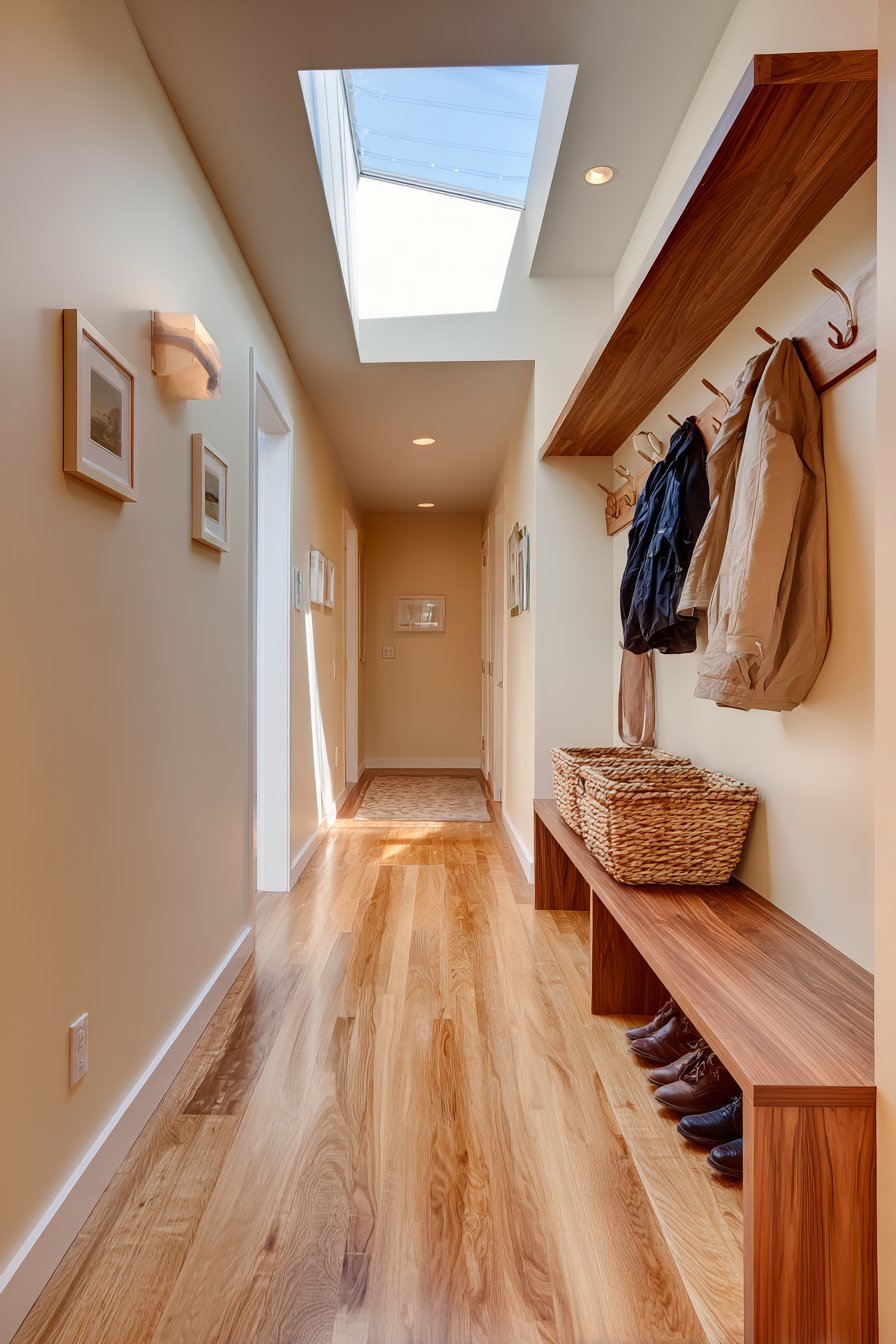 Pale cream walls form the backdrop for this functional display, their light-reflective quality essential in maintaining an open, airy atmosphere. Natural light filters down from a skylight positioned above, illuminating the space with soft, diffused daylight that eliminates the tunnel effect common in narrow corridors. The hardwood flooring beneath showcases its own natural grain patterns, creating visual continuity with the walnut console above and grounding the design in natural materials that age beautifully over time.