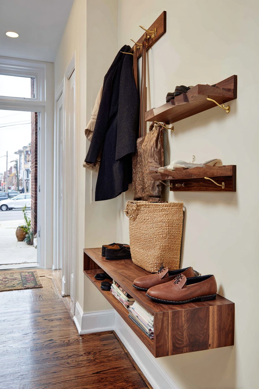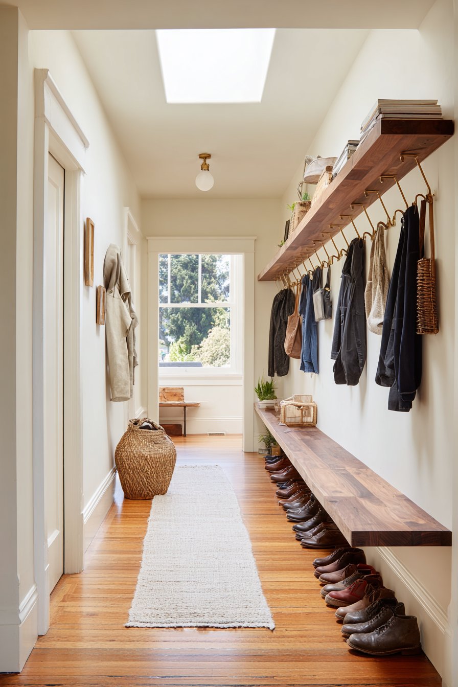 This narrow entryway demonstrates the power of thinking vertically when horizontal space is at a premium. A wall-mounted floating shelf console crafted from natural walnut extends only ten inches from the wall, preserving precious walkway clearance while providing essential functionality. The rich, warm tones of the walnut bring organic beauty to the space, with visible grain patterns adding textural interest that catches the eye without overwhelming the senses. Below the console, a woven basket sits discreetly on the floor, offering convenient shoe storage that keeps clutter contained yet accessible.