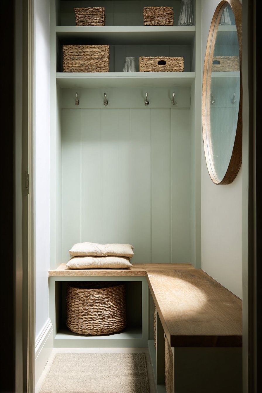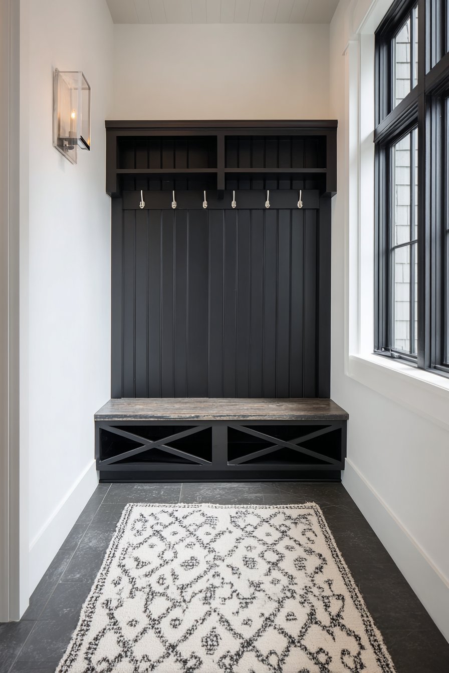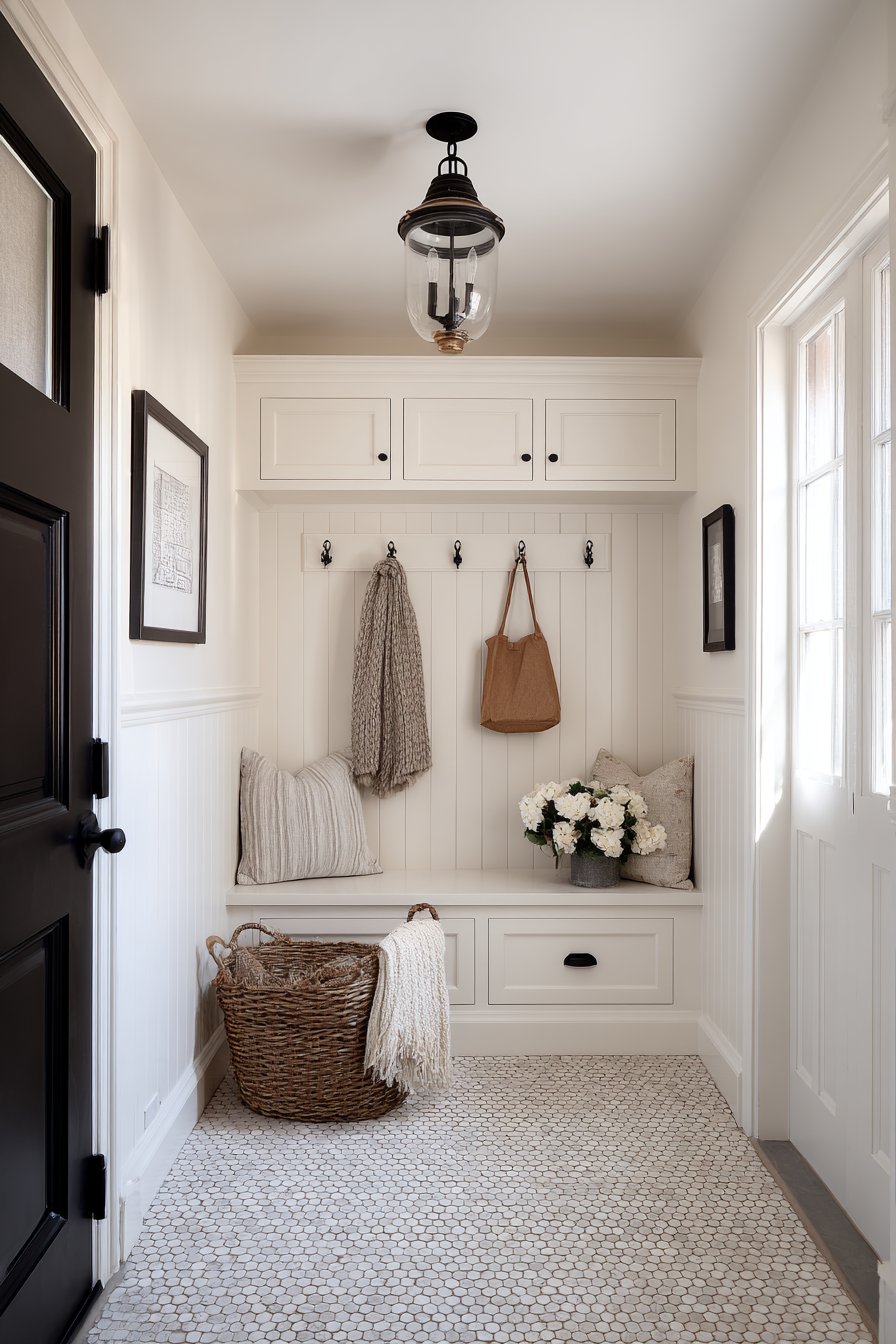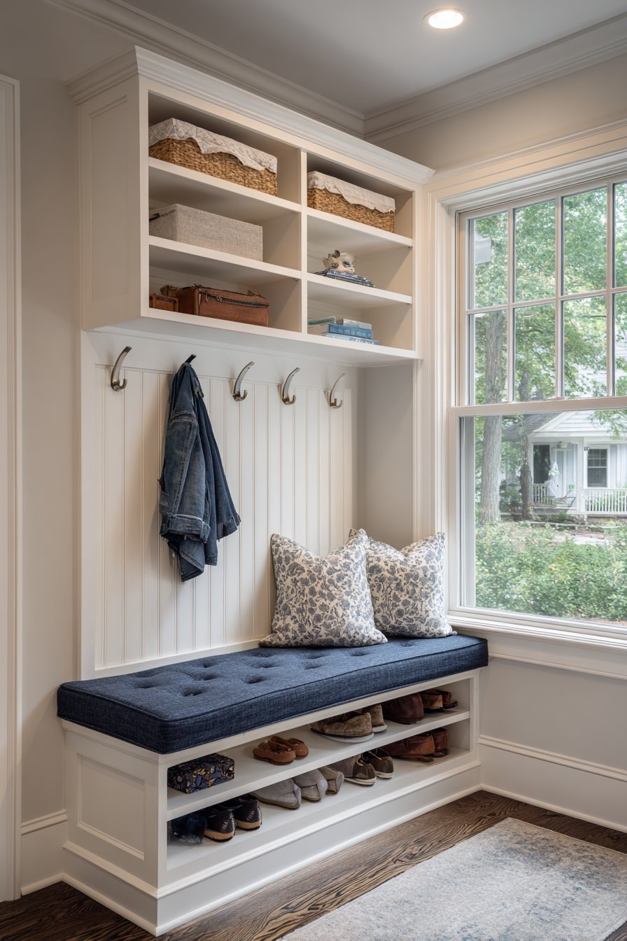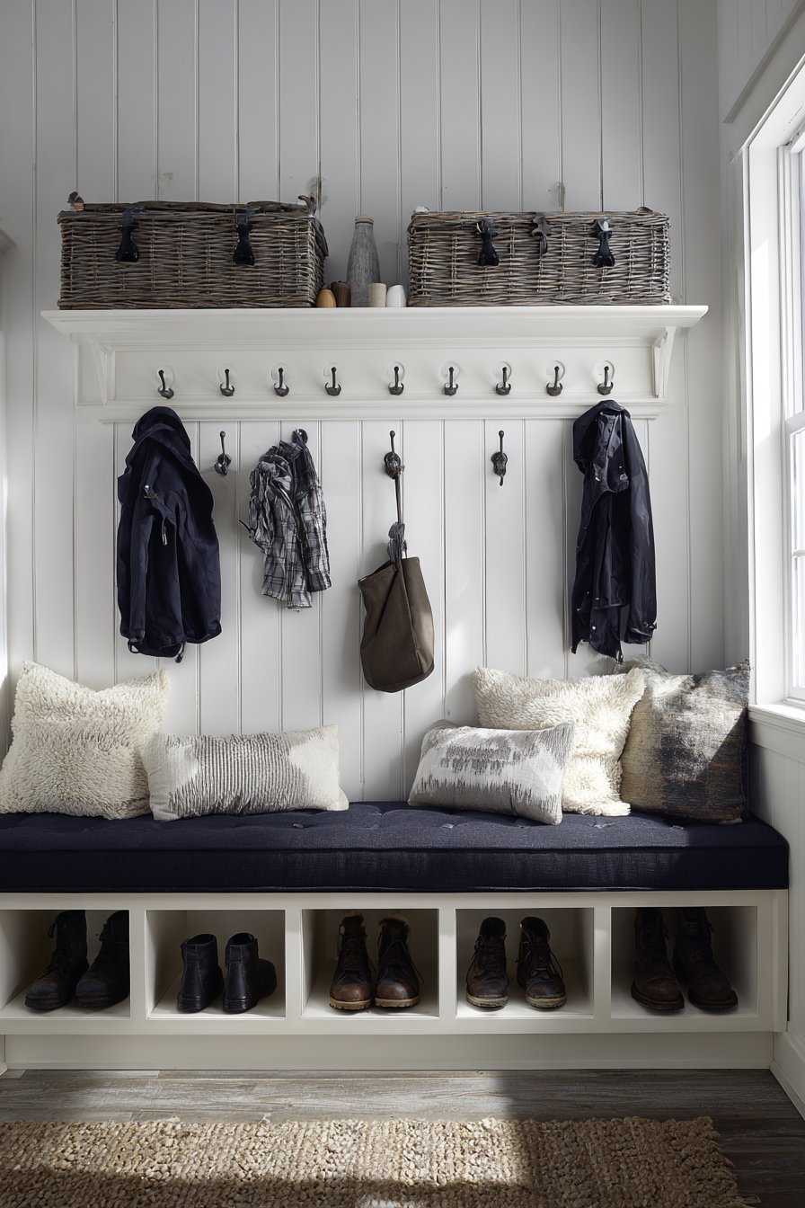 Key Design Tips: Design built-in bench seating with hinged lids to maximize hidden storage capacity in narrow entryways. Upholster bench cushions in performance fabrics that resist staining and wear in high-traffic areas. Include open cubbies below seating for everyday item storage that remains visible and accessible. Install beadboard backing behind hooks to create defined hanging zones while protecting walls. Choose subtle tufting details to add visual interest without creating cleaning challenges.