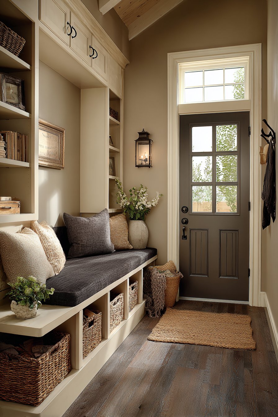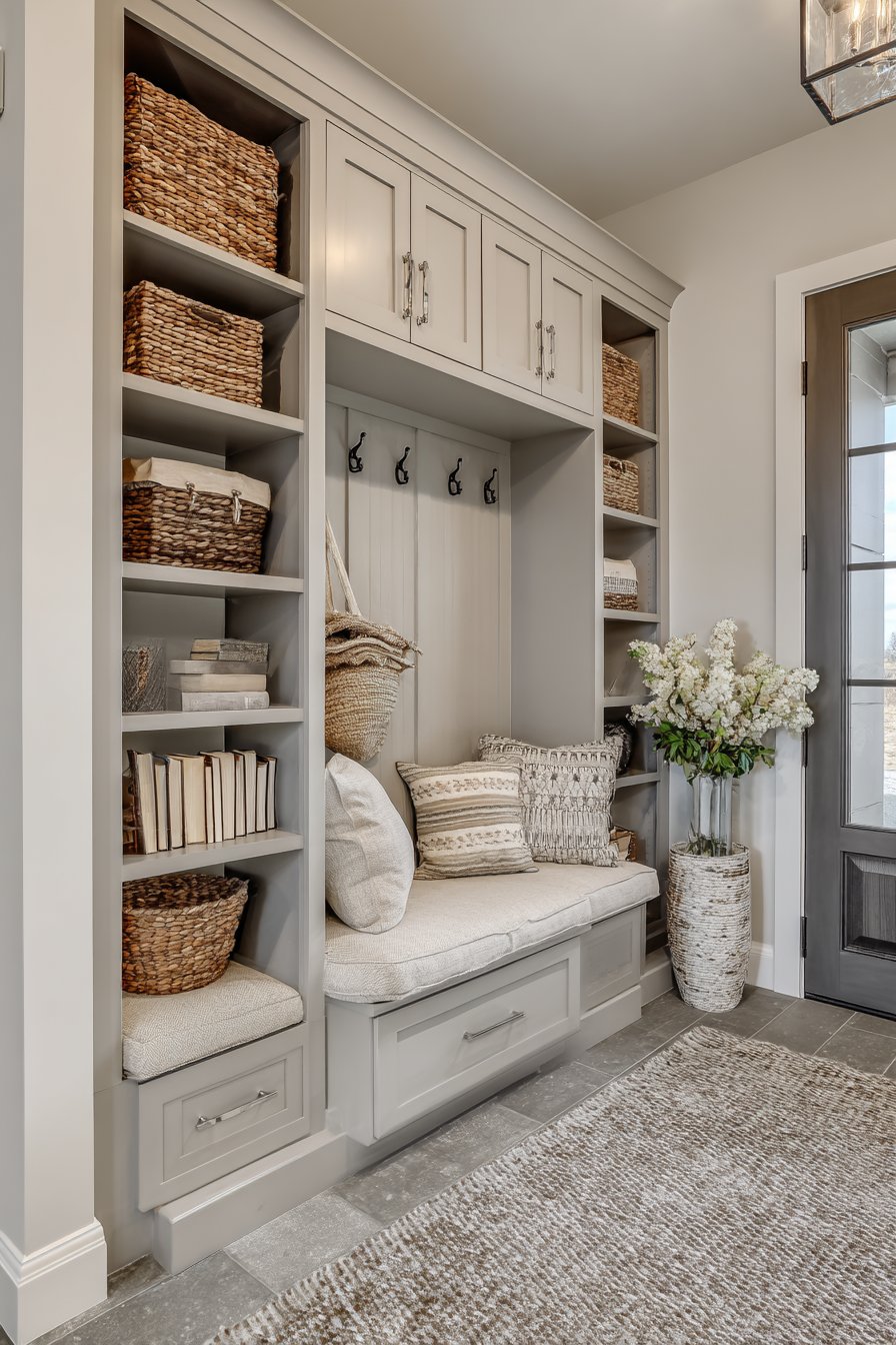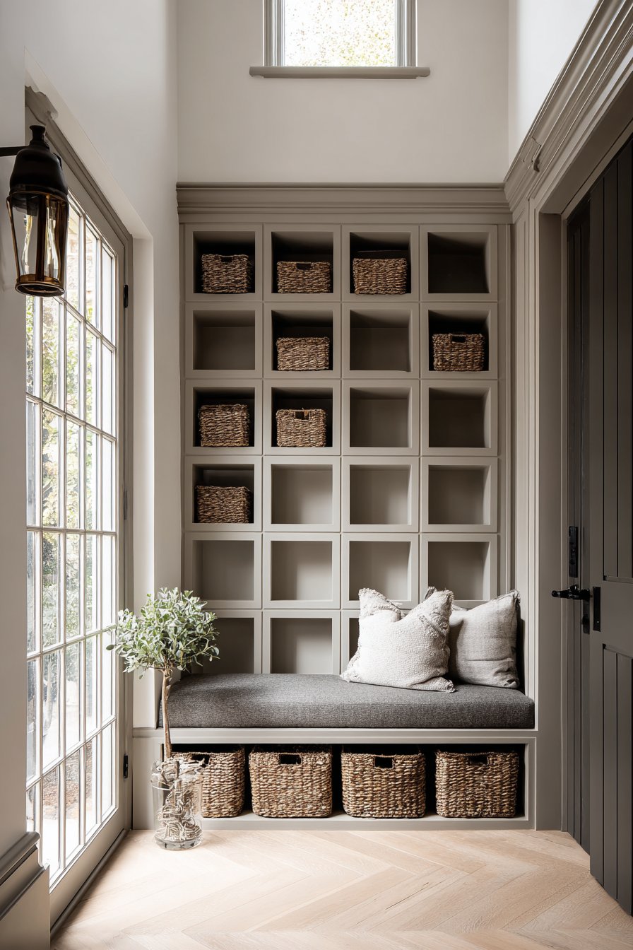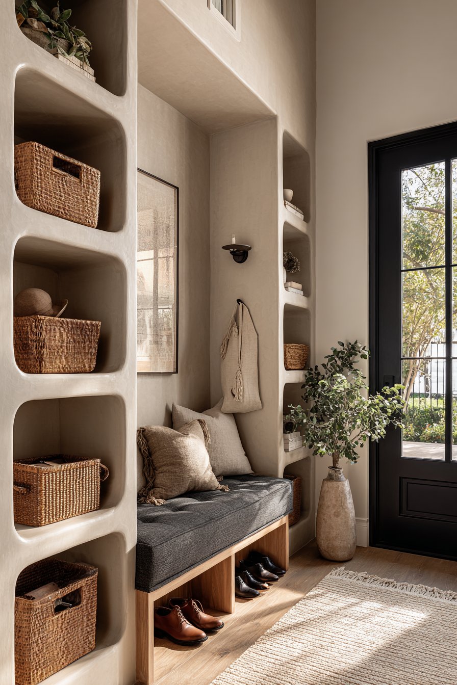 Key Design Tips: Consider built-in niches to create storage without reducing walkway space in narrow entryways. Use uniform storage containers like matching baskets to maintain visual cohesion across multiple storage areas. Install transom windows above doors to bring natural light without consuming wall space. Select bench seating with open storage below to double functionality within a single footprint. Paint built-ins in warm neutrals rather than stark white to add depth and sophistication.