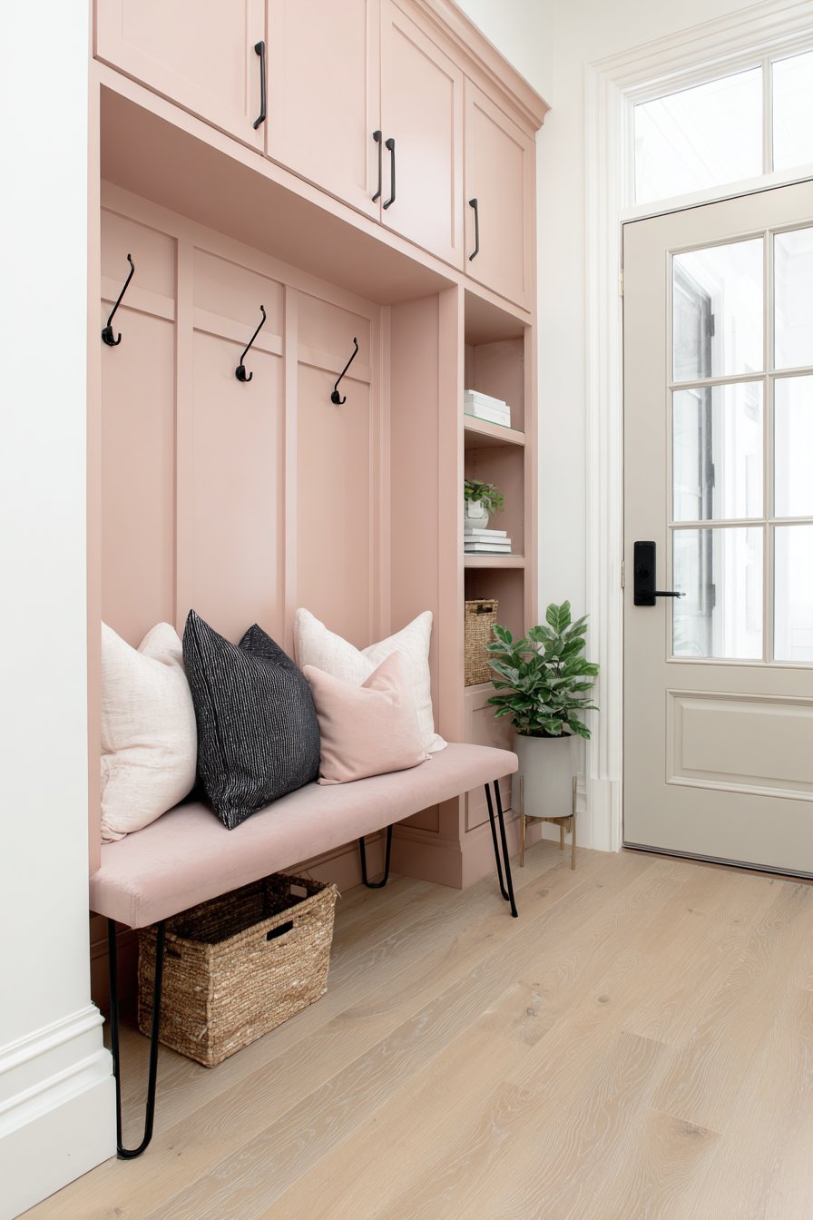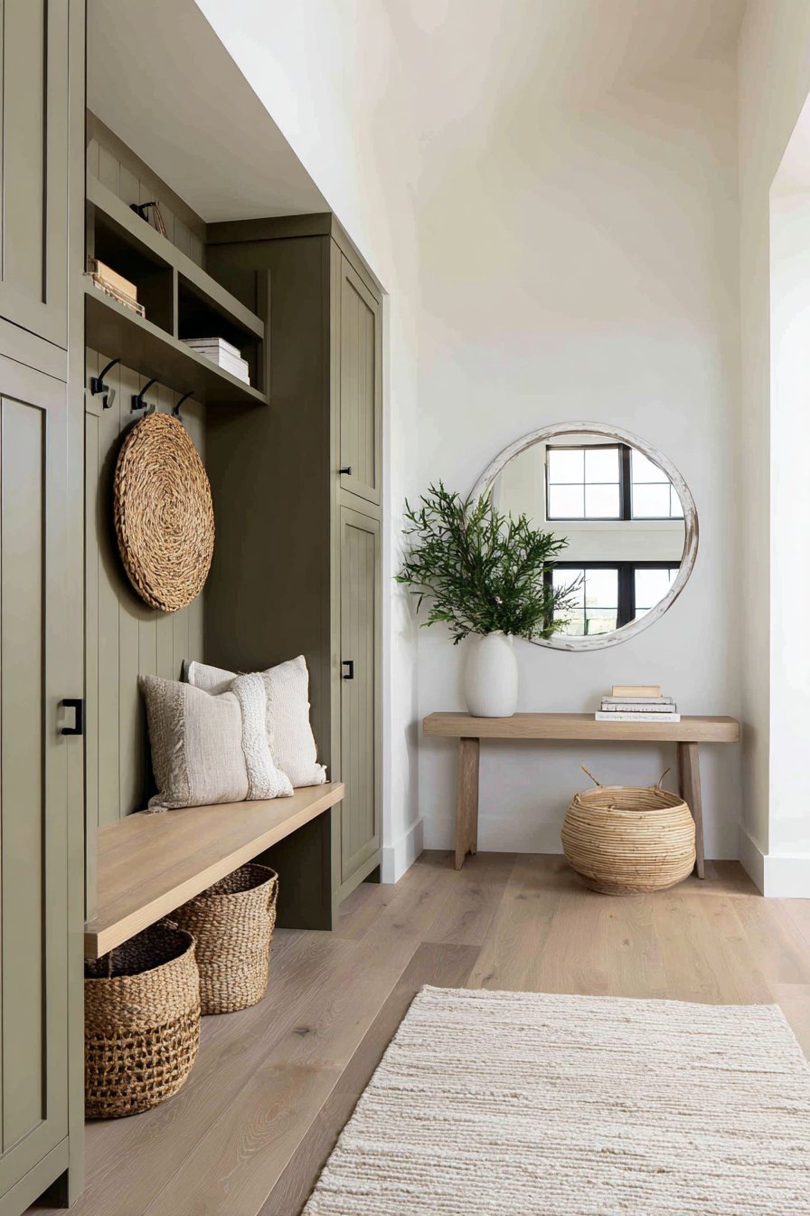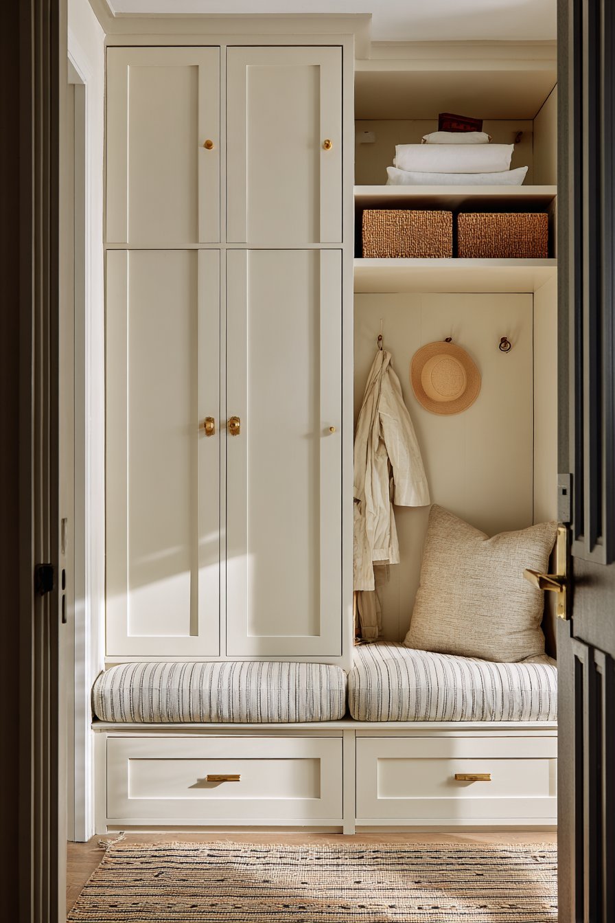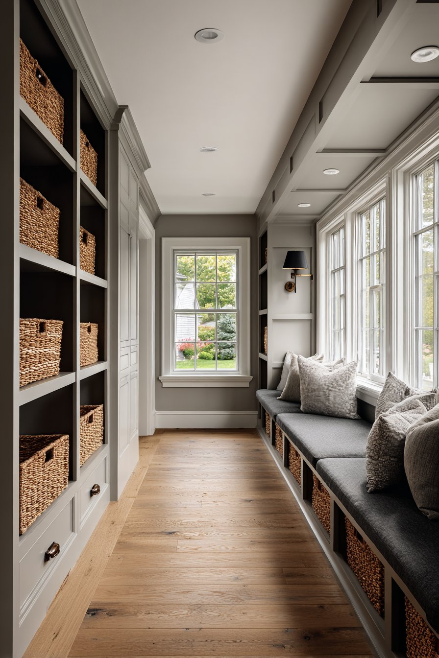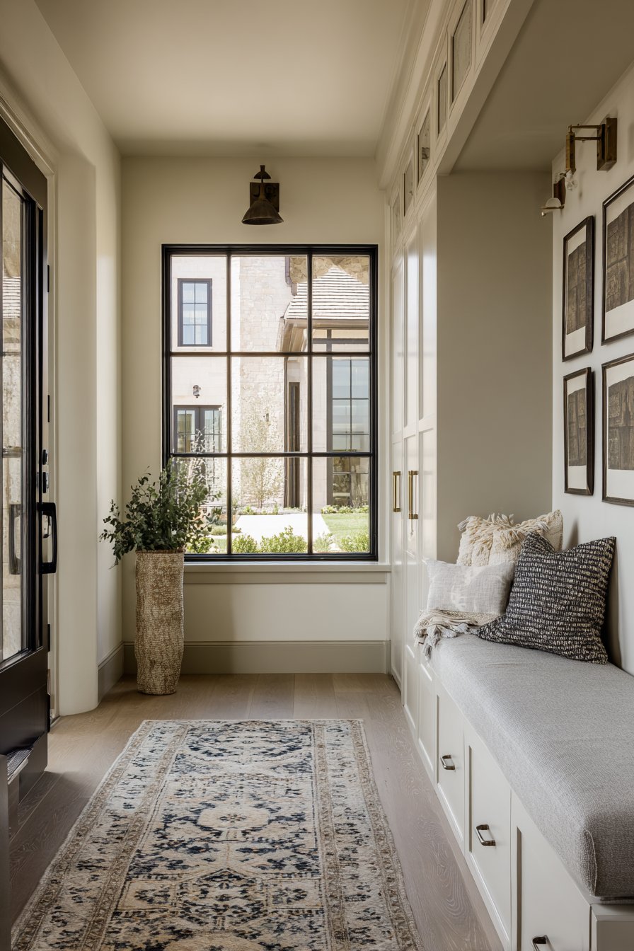 Key Design Tips: Consider built-in niches to create storage without reducing walkway space in narrow entryways. Use uniform storage containers like matching baskets to maintain visual cohesion across multiple storage areas. Install transom windows above doors to bring natural light without consuming wall space. Select bench seating with open storage below to double functionality within a single footprint. Paint built-ins in warm neutrals rather than stark white to add depth and sophistication.