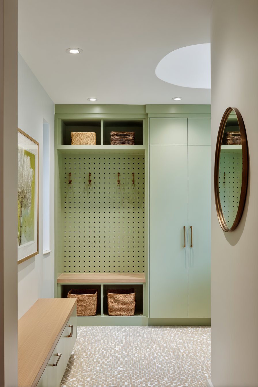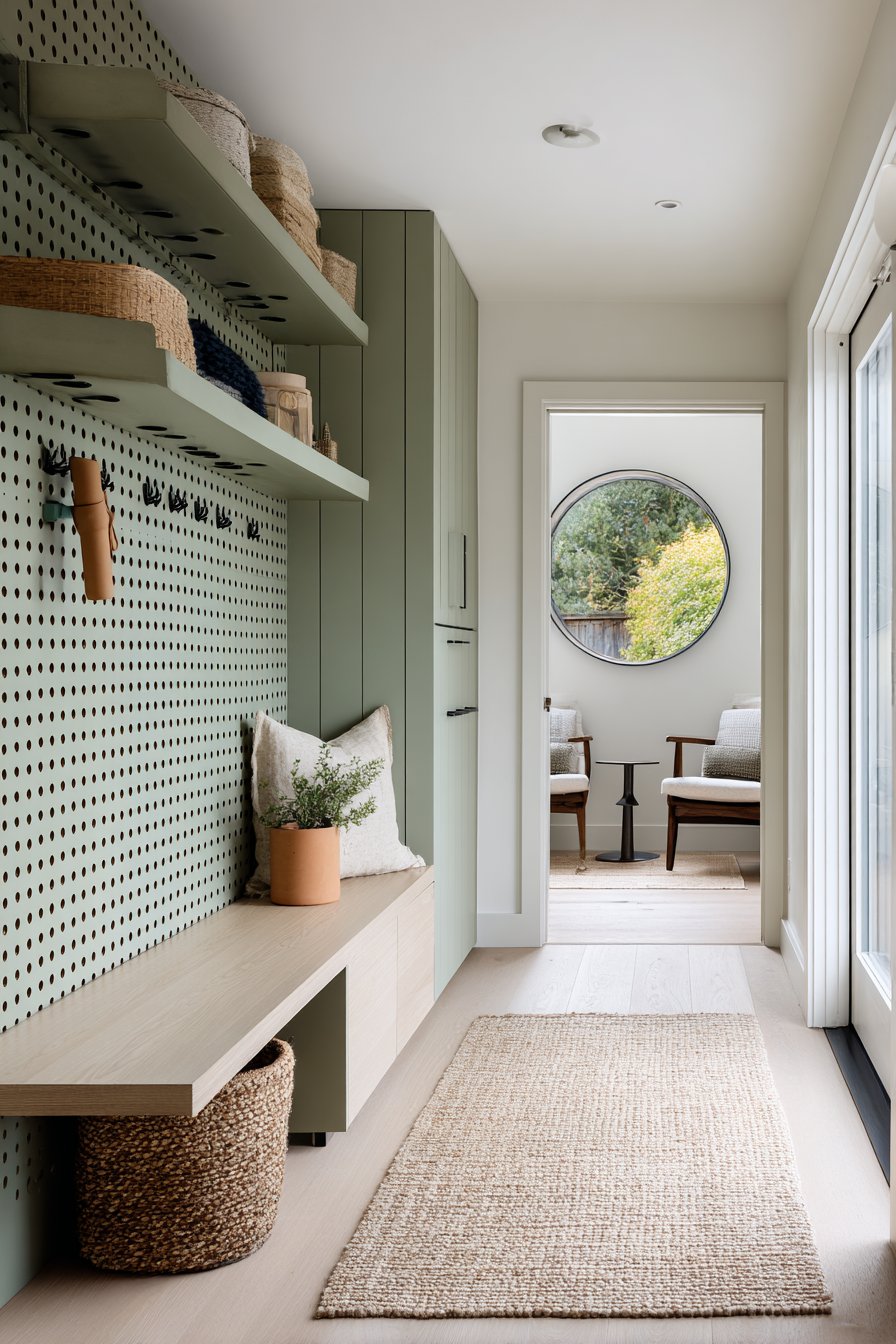 This narrow entryway showcases one of the most adaptable storage solutions available—a pegboard system that transforms ordinary wall space into endlessly configurable organization. Painted in soft sage green, the pegboard becomes an attractive design element rather than merely functional hardware. Various hooks, small shelves, and baskets attach to the board, creating a storage system that can be reorganized as needs change—a crucial feature in narrow entryways where flexibility is paramount.