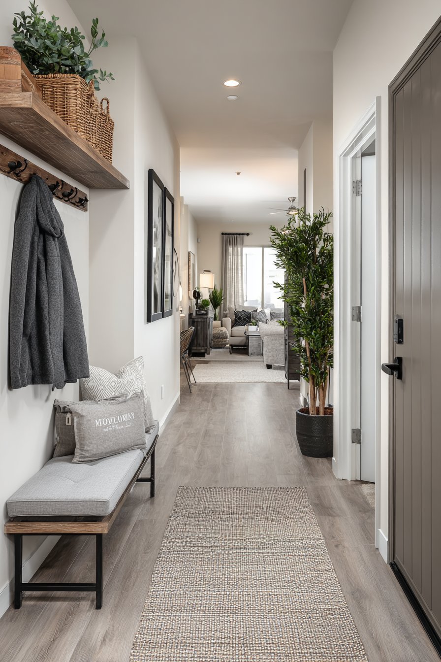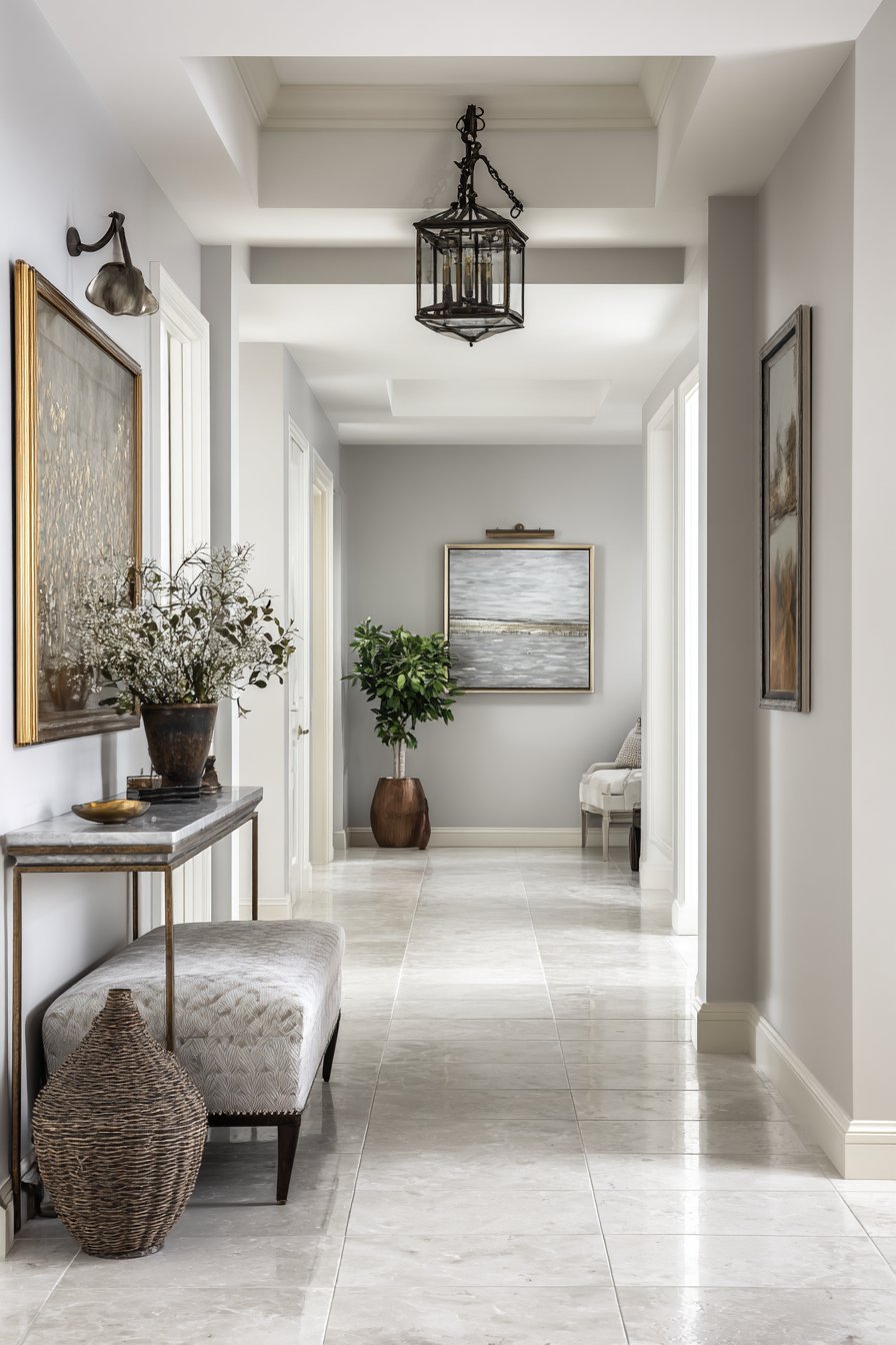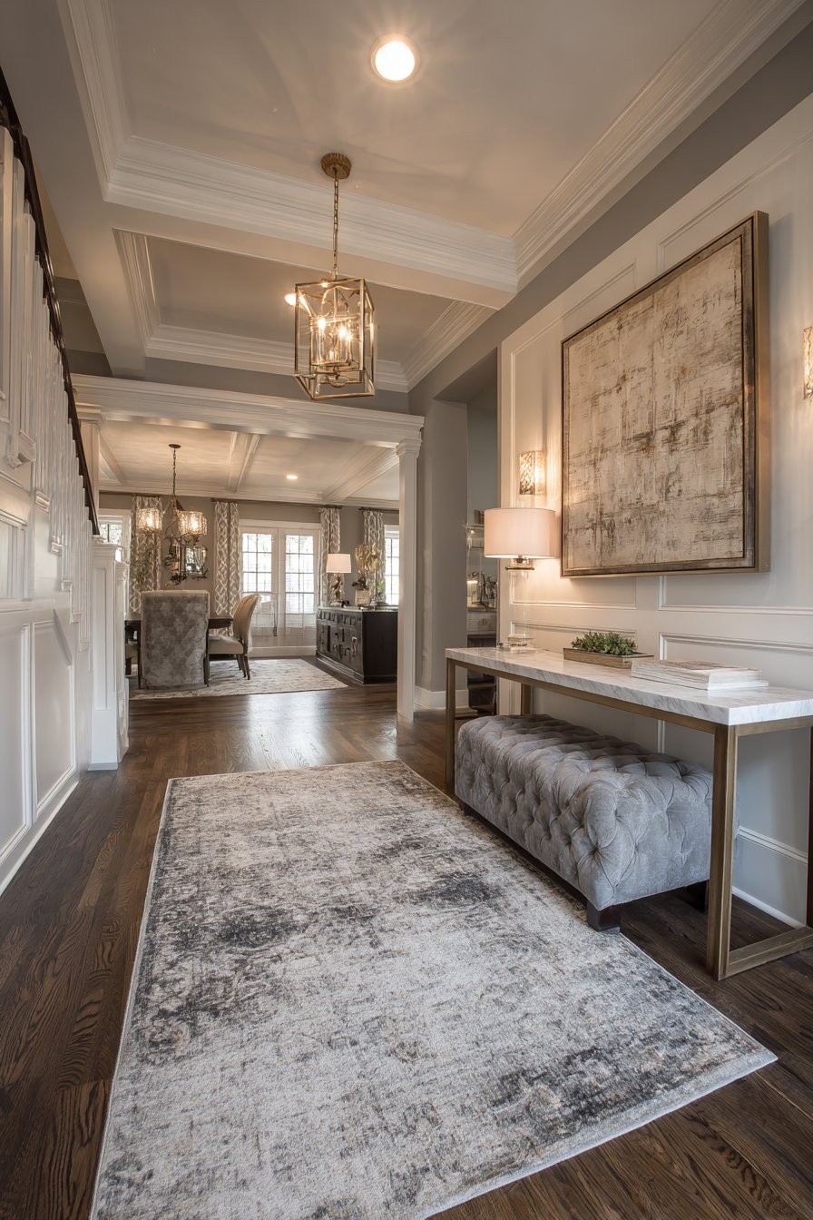 This narrow entryway embodies transitional design’s ability to bridge traditional and contemporary aesthetics through refined material choices and balanced composition. Soft gray walls provide a sophisticated backdrop while white crown molding adds architectural detail that references classical design without appearing fussy or dated. This combination creates visual interest through subtle contrast rather than bold statements, perfectly suited to a narrow space that could easily feel overwhelming.
