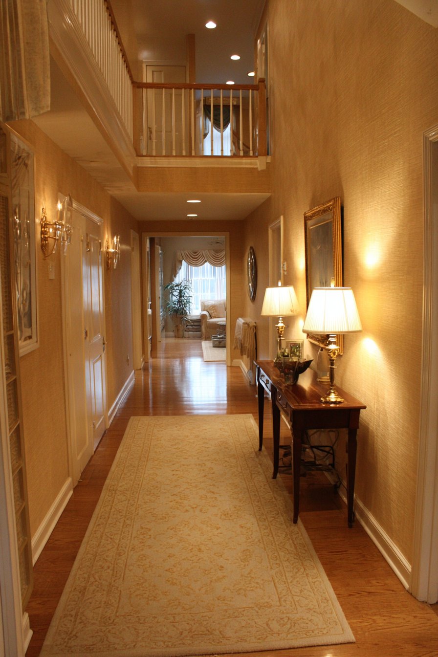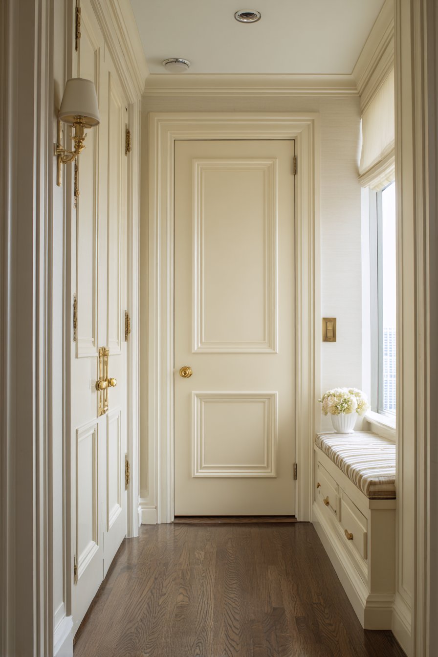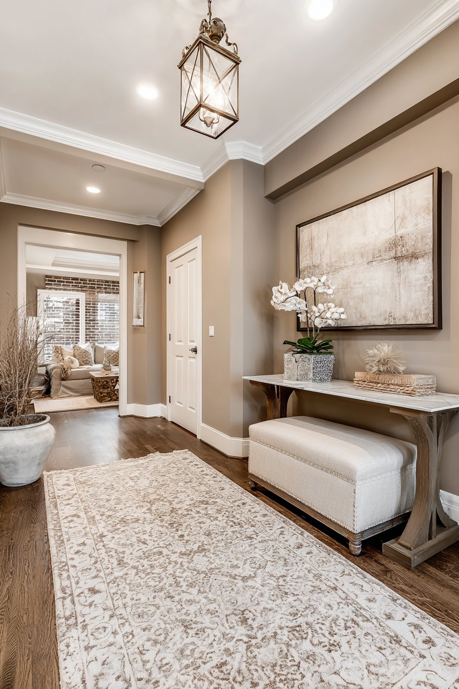 This narrow entryway embodies transitional design’s ability to bridge traditional and contemporary aesthetics through refined material choices and balanced composition. Soft gray walls provide a sophisticated backdrop while white crown molding adds architectural detail that references classical design without appearing fussy or dated. This combination creates visual interest through subtle contrast rather than bold statements, perfectly suited to a narrow space that could easily feel overwhelming.