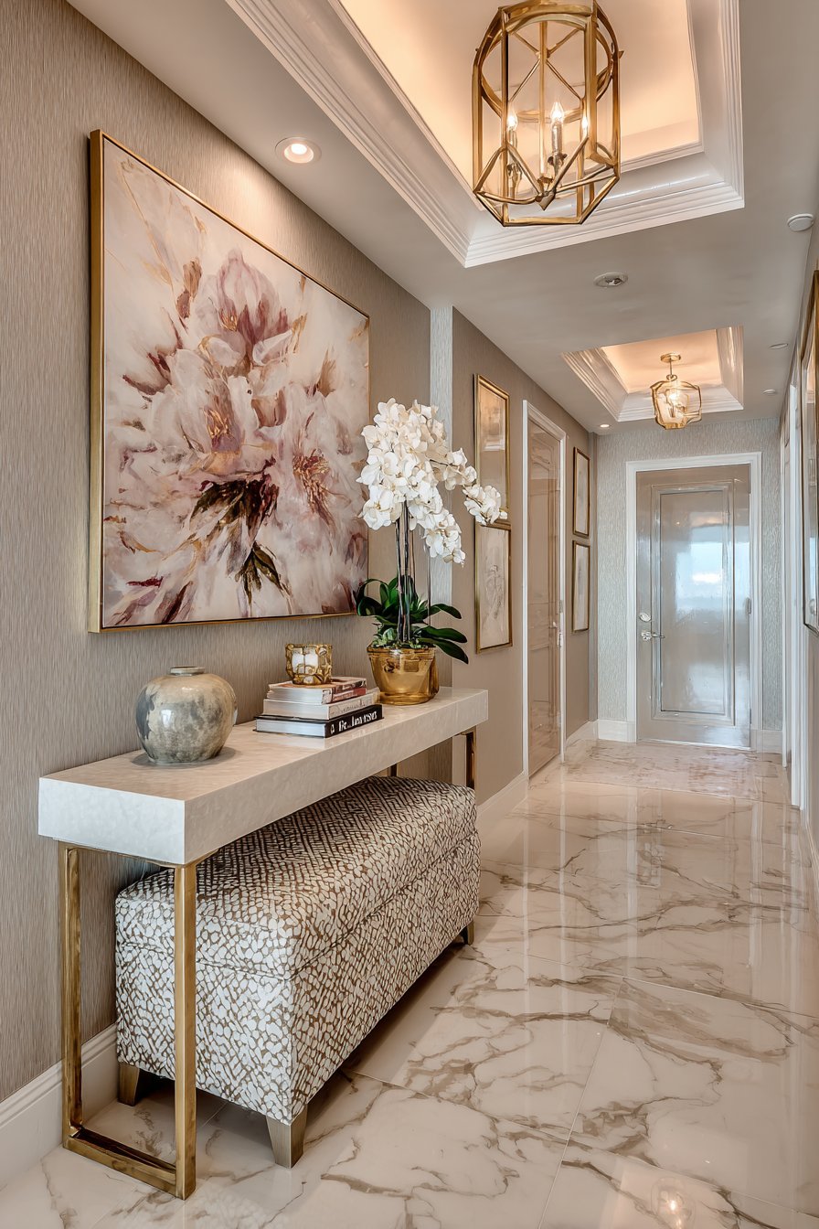 Key Design Tips: Use soft gray paint colors to create sophisticated backgrounds that work with both traditional and contemporary elements. Install crown molding to add architectural interest without consuming floor or wall space. Choose console tables no deeper than 12 inches with refined details like marble tops and brass legs. Select storage ottomans that slide under consoles for hidden functionality. Implement layered lighting with both recessed and decorative fixtures for flexibility and ambiance.