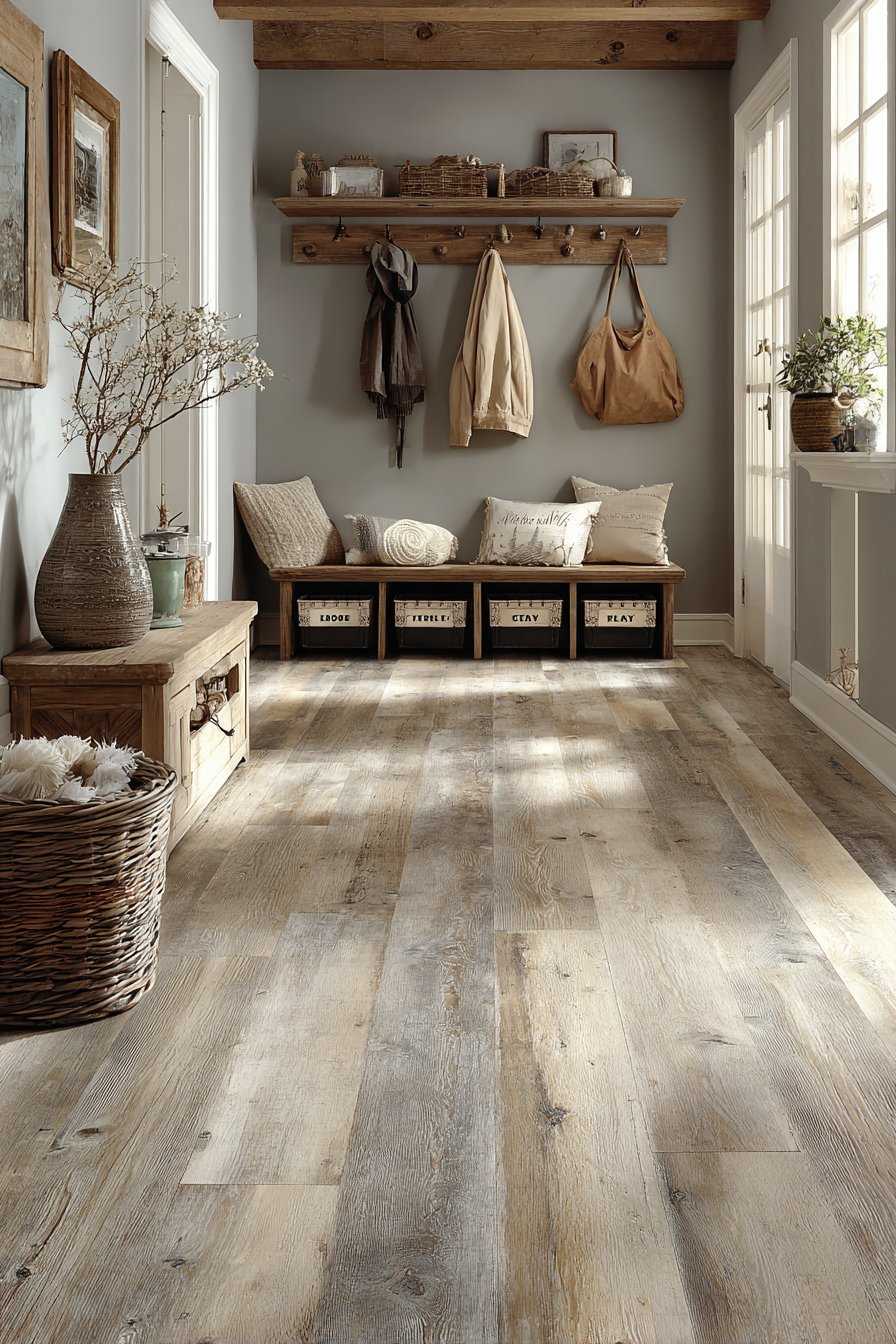 Durable luxury vinyl plank flooring in a weathered oak finish provides the resilience necessary for high-traffic family use while maintaining attractive appearance. This practical material choice acknowledges the reality of muddy shoes, dropped backpacks, and daily wear, selecting function over fashion without sacrificing aesthetic appeal. The wide-angle interior photography captures the comprehensive organizational system, showing how intentional design can transform a narrow corridor into a hardworking family hub.