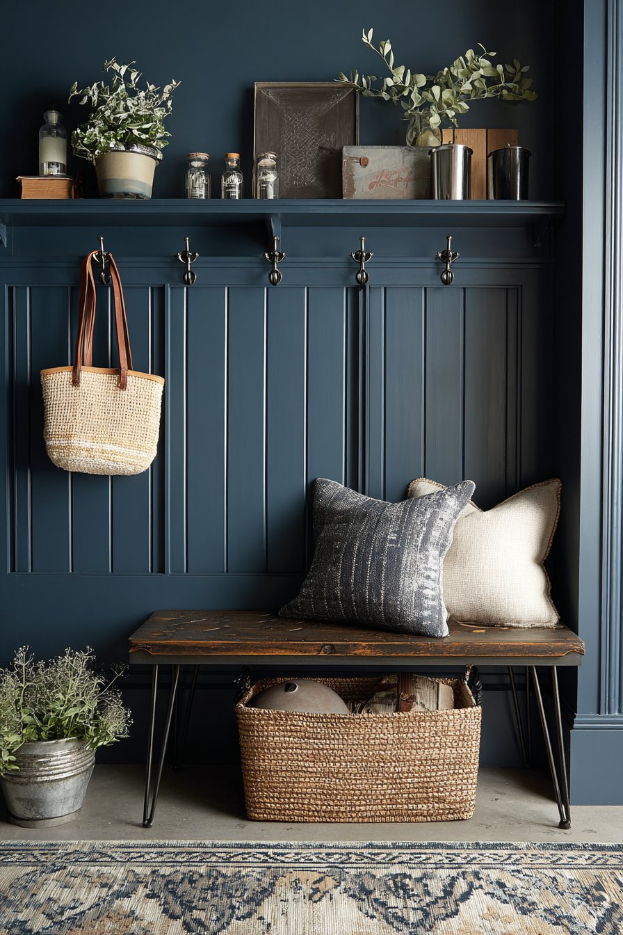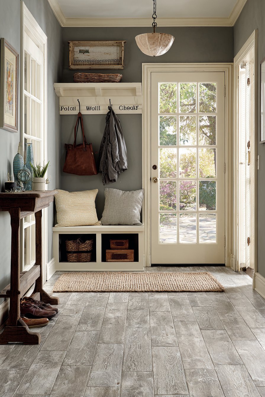 Key Design Tips: Install board-and-batten wainscoting to add architectural detail and visual interest to plain walls in narrow entryways. Use contrasting colors between upper and lower walls to create dynamic visual impact and apparent height. Select furniture with distinctive leg details like X-patterns to add character without requiring additional floor space. Mount rail systems for flexible hook placement that adapts to changing storage needs. Choose distressed finishes to add instant patina and farmhouse authenticity.