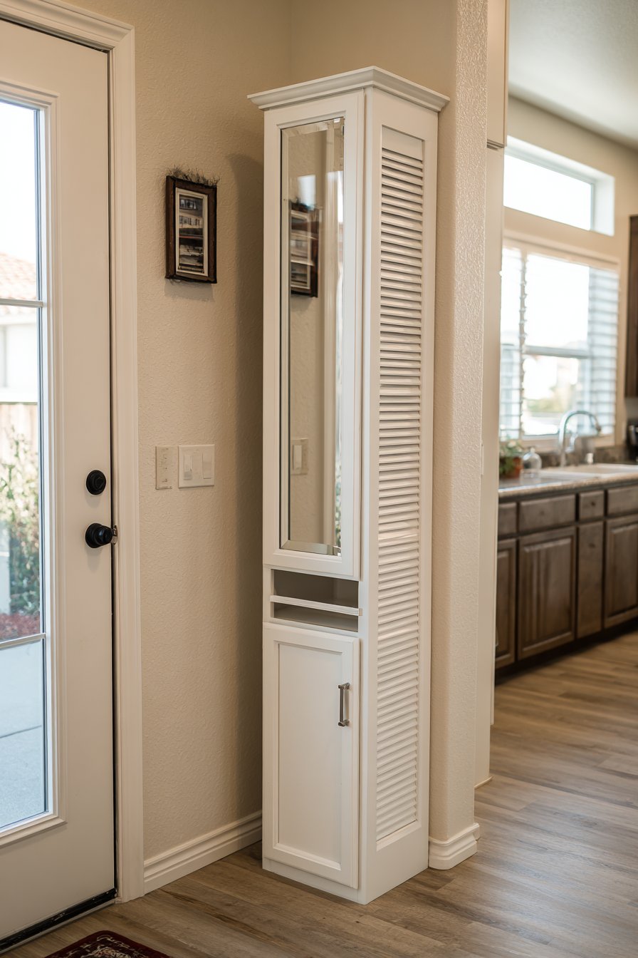 Adjacent to the tall cabinet, a slim full-length mirror mounts to the wall, serving the practical function of last-minute appearance checks before heading out. The mirror’s narrow profile and simple frame ensure it doesn’t compete with the cabinet for visual attention, instead complementing the clean-lined aesthetic. Soft morning light filters through from a nearby source, highlighting the subtle texture of the louvered doors and creating gentle shadows that add dimension to the otherwise flat surfaces.