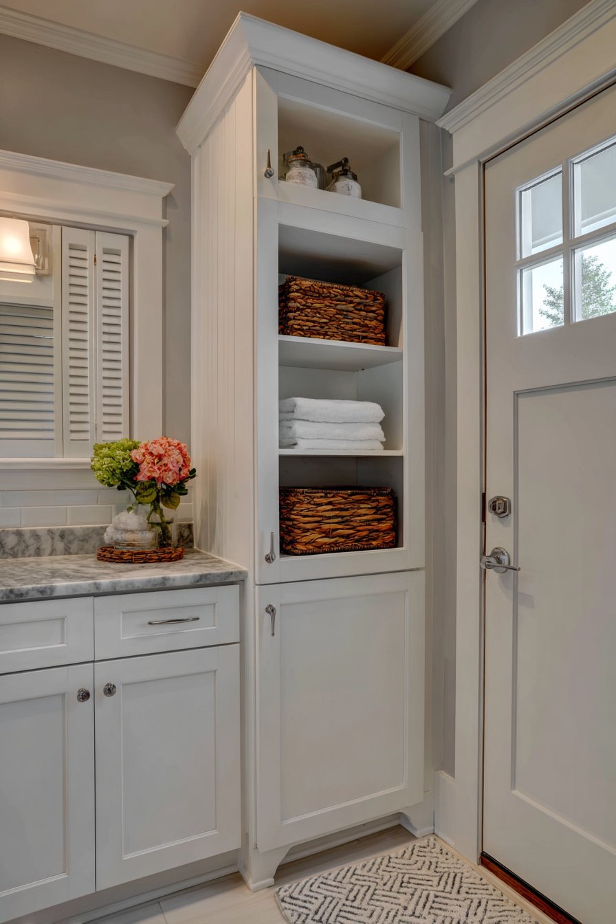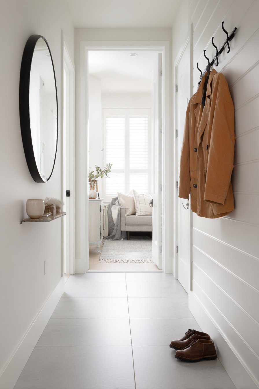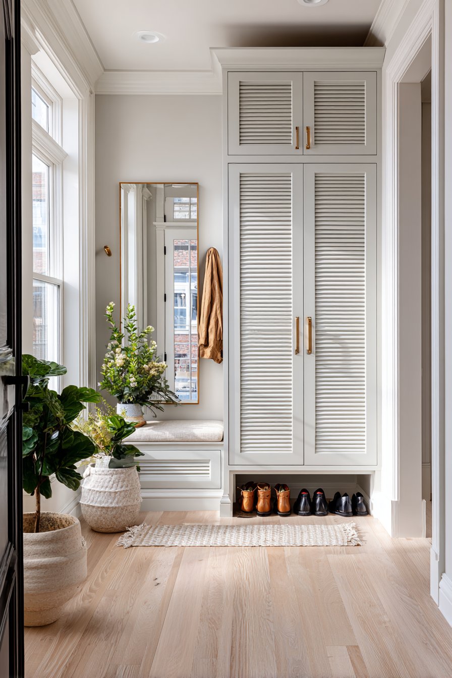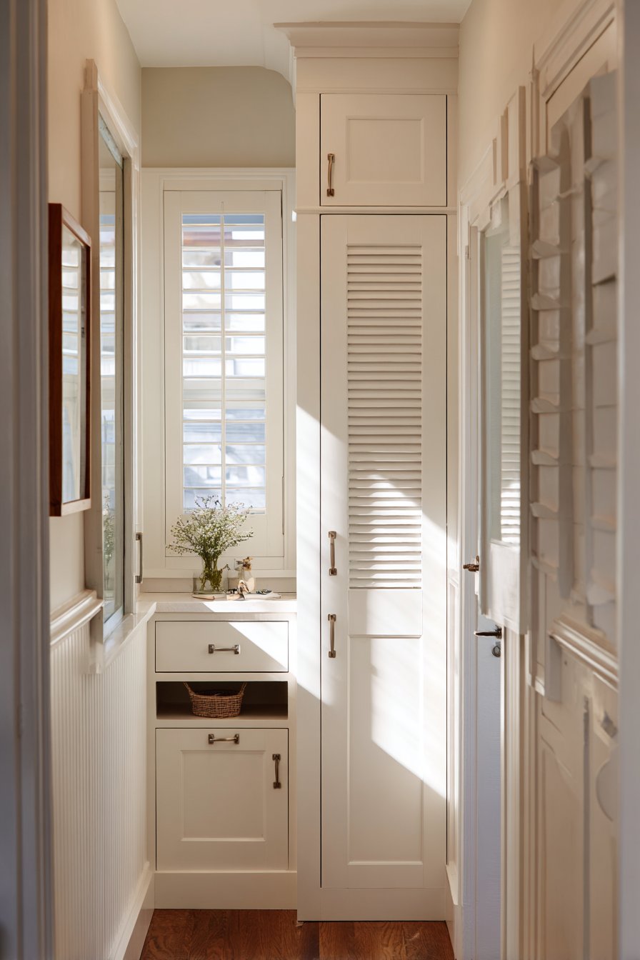 This narrow entryway demonstrates the power of concealment in maintaining visual calm within tight quarters. A tall cabinet reaching from floor to ceiling measures only sixteen inches deep, yet provides substantial hidden storage capacity behind louvered doors in crisp white finish. The louvered treatment adds textural interest through its parallel slats while maintaining the clean, airy aesthetic essential in narrow spaces—unlike solid cabinet doors that could feel heavy or imposing.