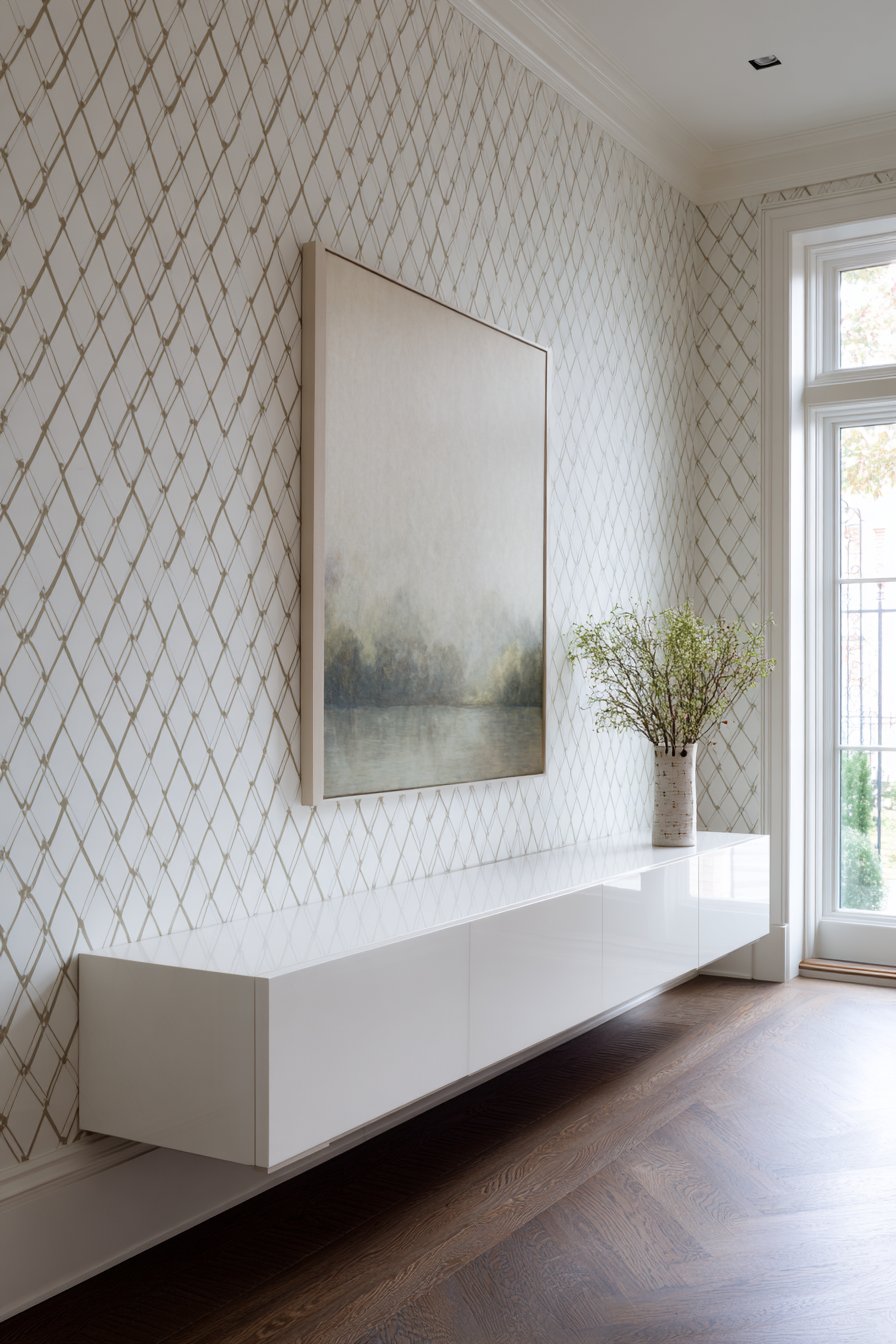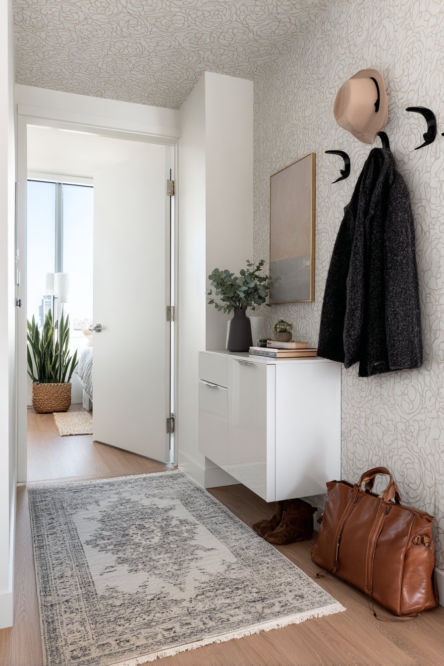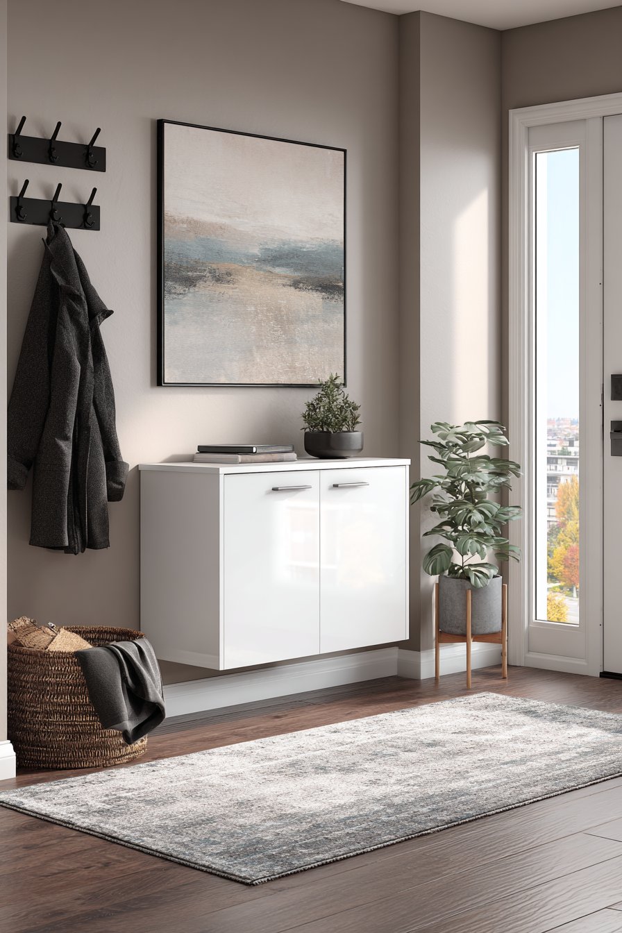 This narrow entryway embraces contemporary minimalism through its use of floating elements that create visual lightness despite providing substantial functionality. A floating credenza in high-gloss white lacquer mounts to the wall at thirty inches height, appearing to hover above the floor. This elevation serves both aesthetic and practical purposes—visually, it maintains sight lines and prevents the narrow space from feeling blocked; practically, it allows easy floor cleaning beneath and prevents the accumulation of clutter that often gathers under floor-mounted furniture.