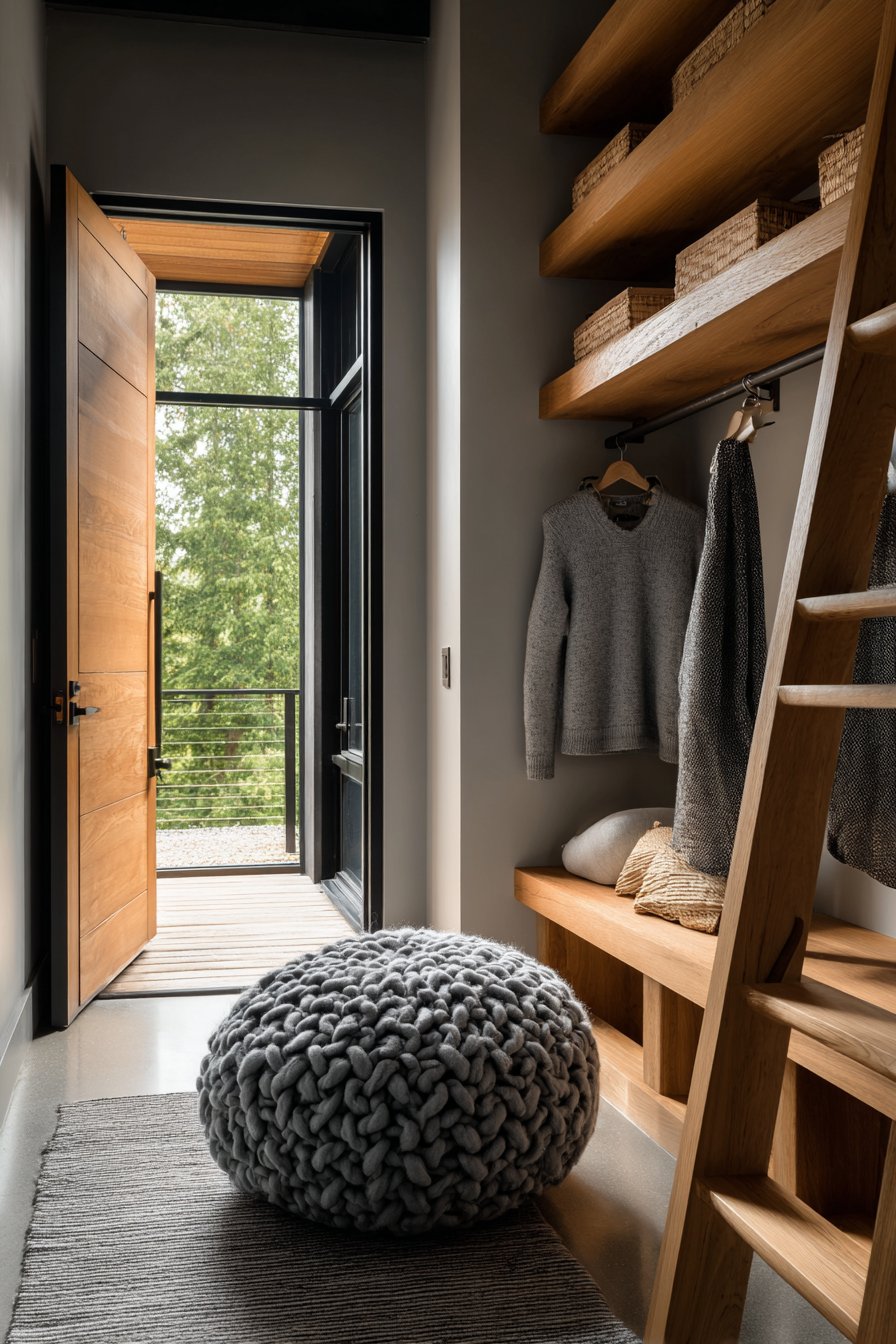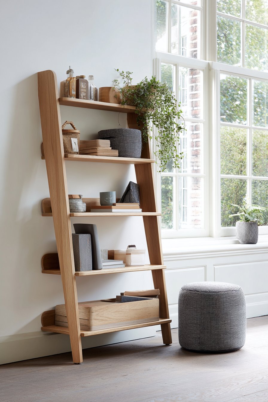 Key Design Tips: Choose leaning ladder shelves for flexible vertical storage that doesn’t require wall mounting or permanent installation. Select graduated shelf depths with wider lower shelves for stability and varied storage options. Add hooks to ladder frames to increase functionality beyond traditional shelf storage. Incorporate portable seating like poufs that store beneath shelving when not needed. Position leaning systems near natural light sources to highlight wood tones and display items.