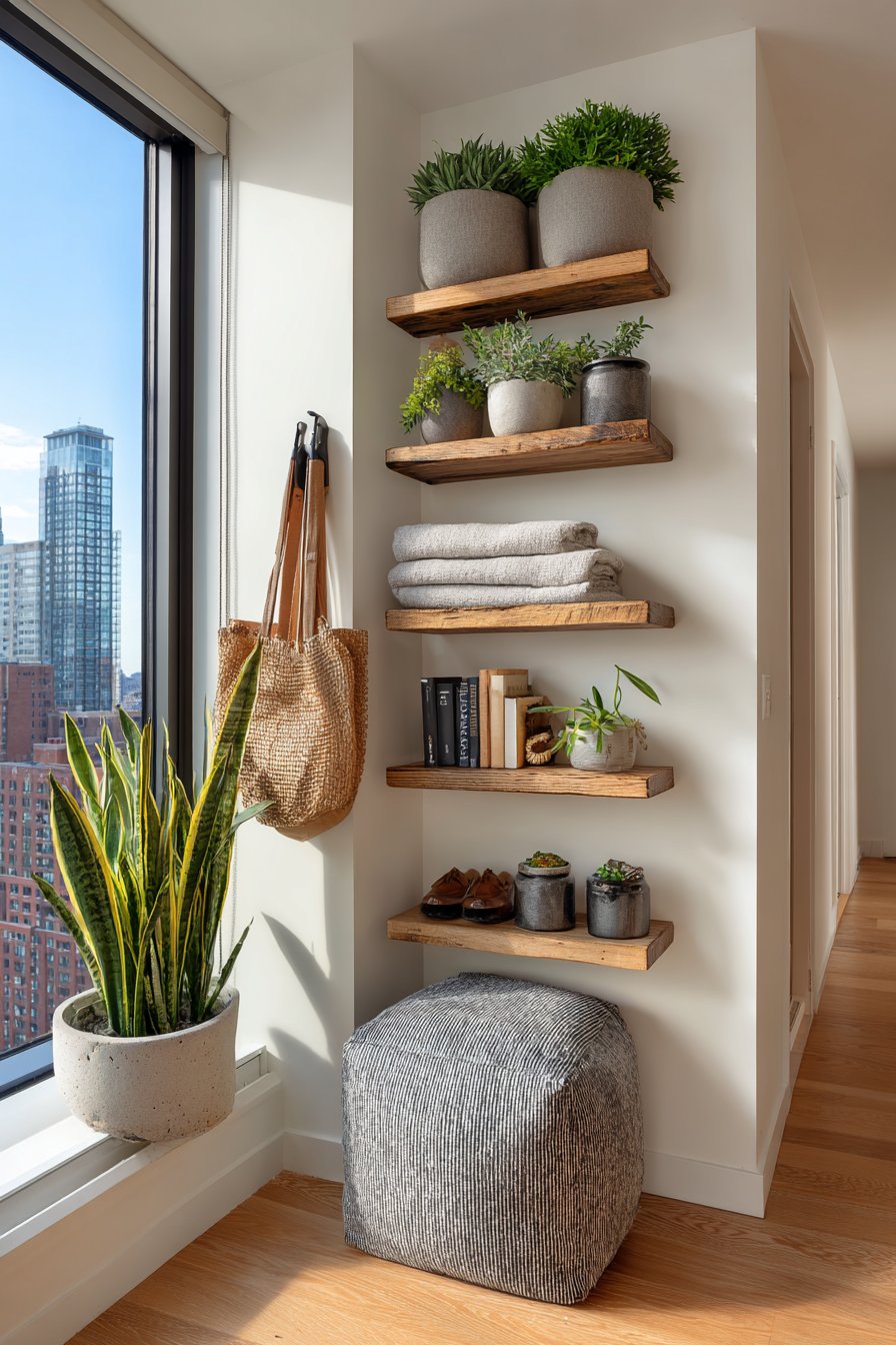Floating shelves wrap around the adjacent wall at eye level, creating a continuous display surface that follows the room’s natural geometry. These shelves showcase small potted plants that add life and color to the space, along with a practical catch-all tray for keys and daily essentials. The wrapped shelf design maintains visual flow while maximizing usable surface area in a space where traditional furniture placement would be impossible.